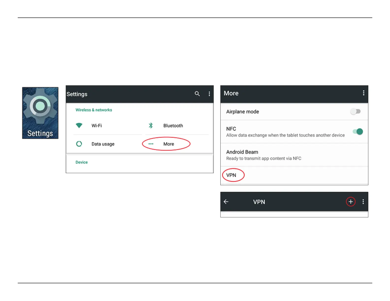 Go to Settings > More from the Wireless & networks > VPN > +
