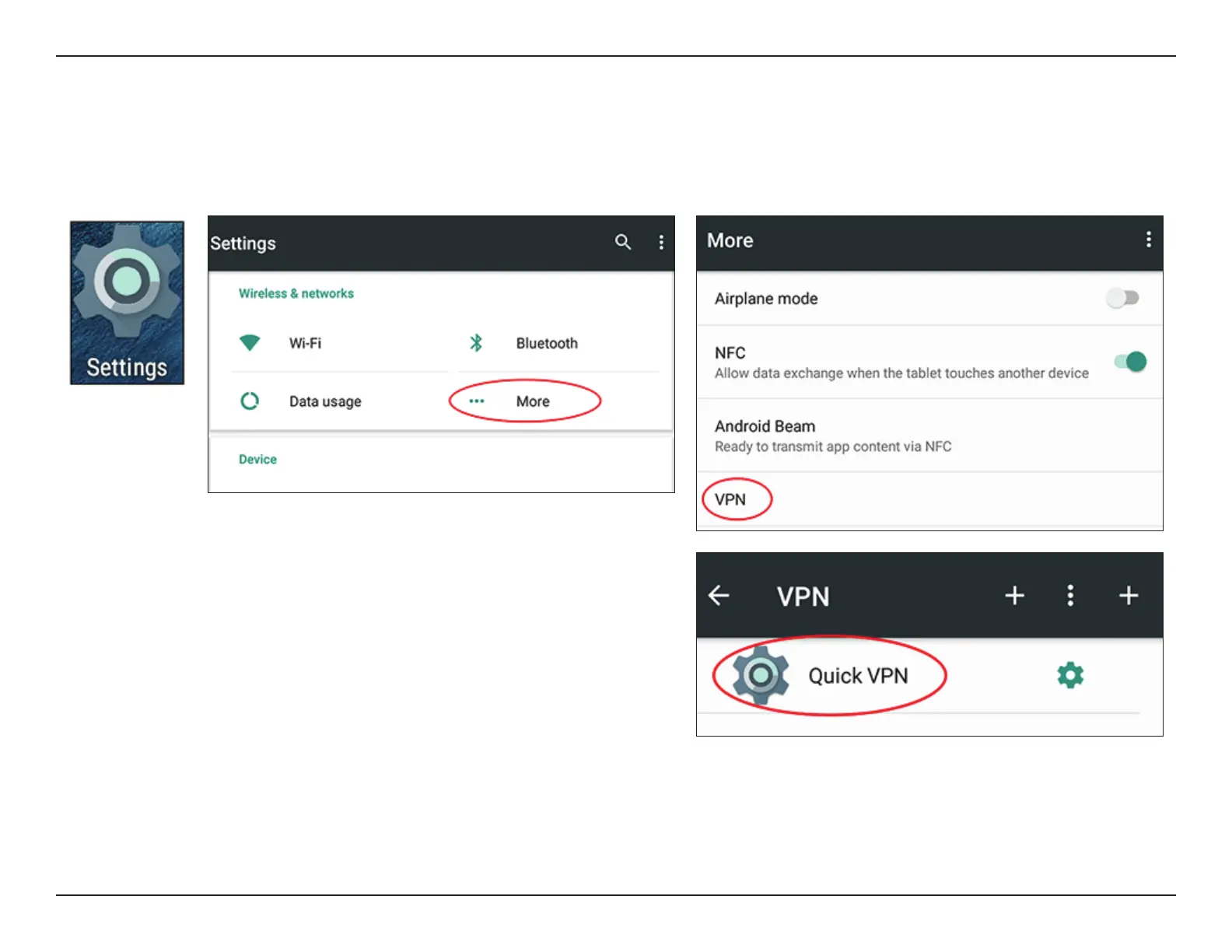 To connect to or disconnect from your Quick VPN server, go to Settings > More from the Wireless & networks > VPN and select the Quick VPN
