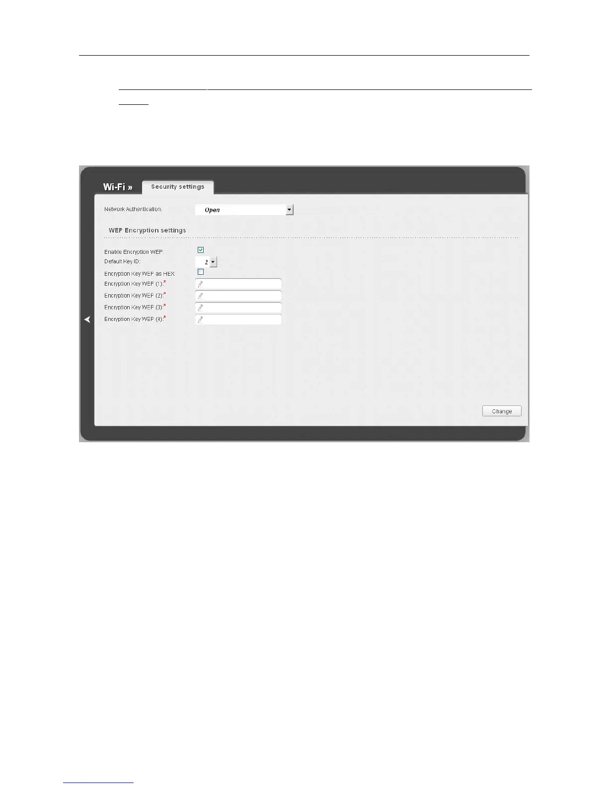 When the Open or Shared value is selected, the WEP Encryption settings section is displayed