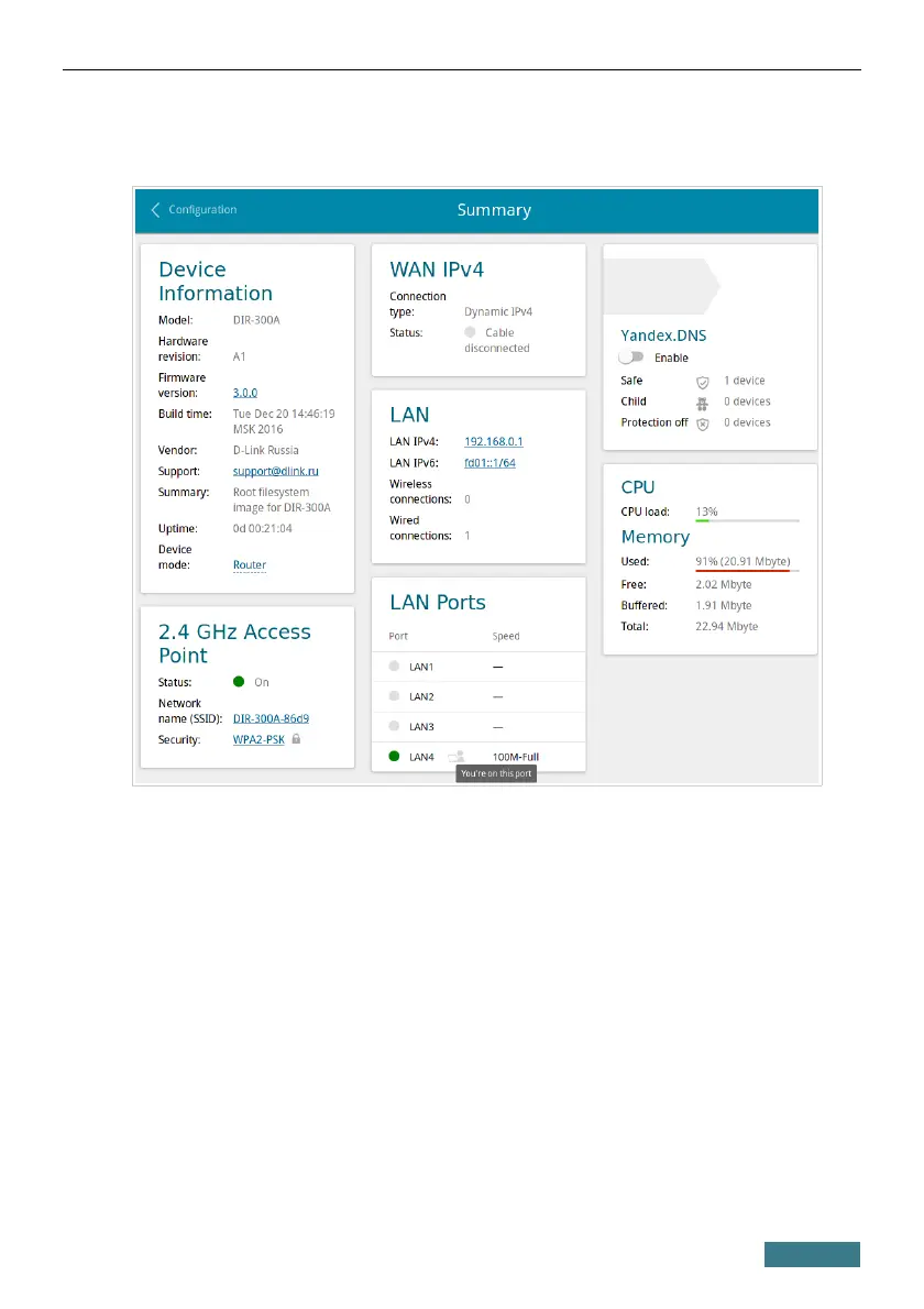 The Summary page displays general information on the router and its