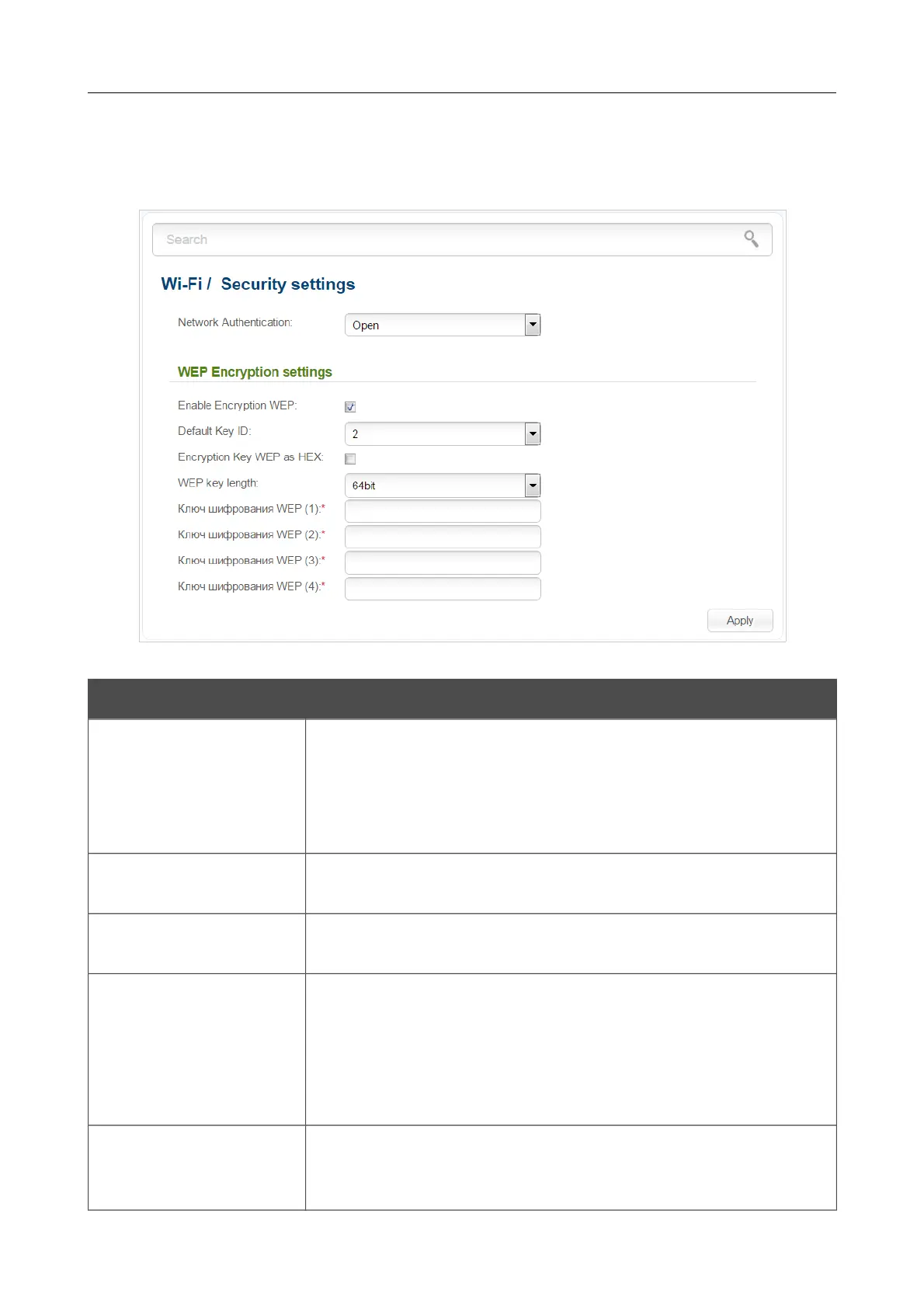 When the Open or Shared value is selected, the WEP Encryption settings section is displayed