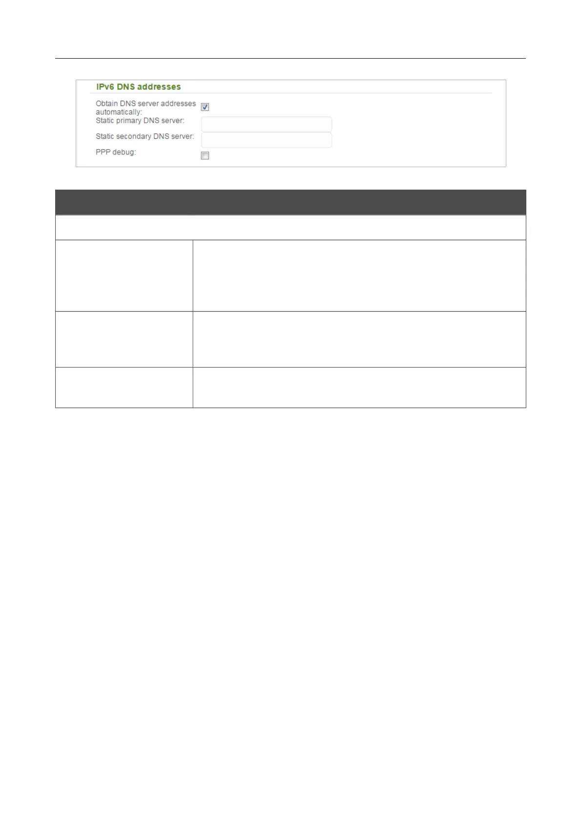 Figure 71. The page for creating a new Pv6 PPPoE connection. The IPv6 DNS addresses section.