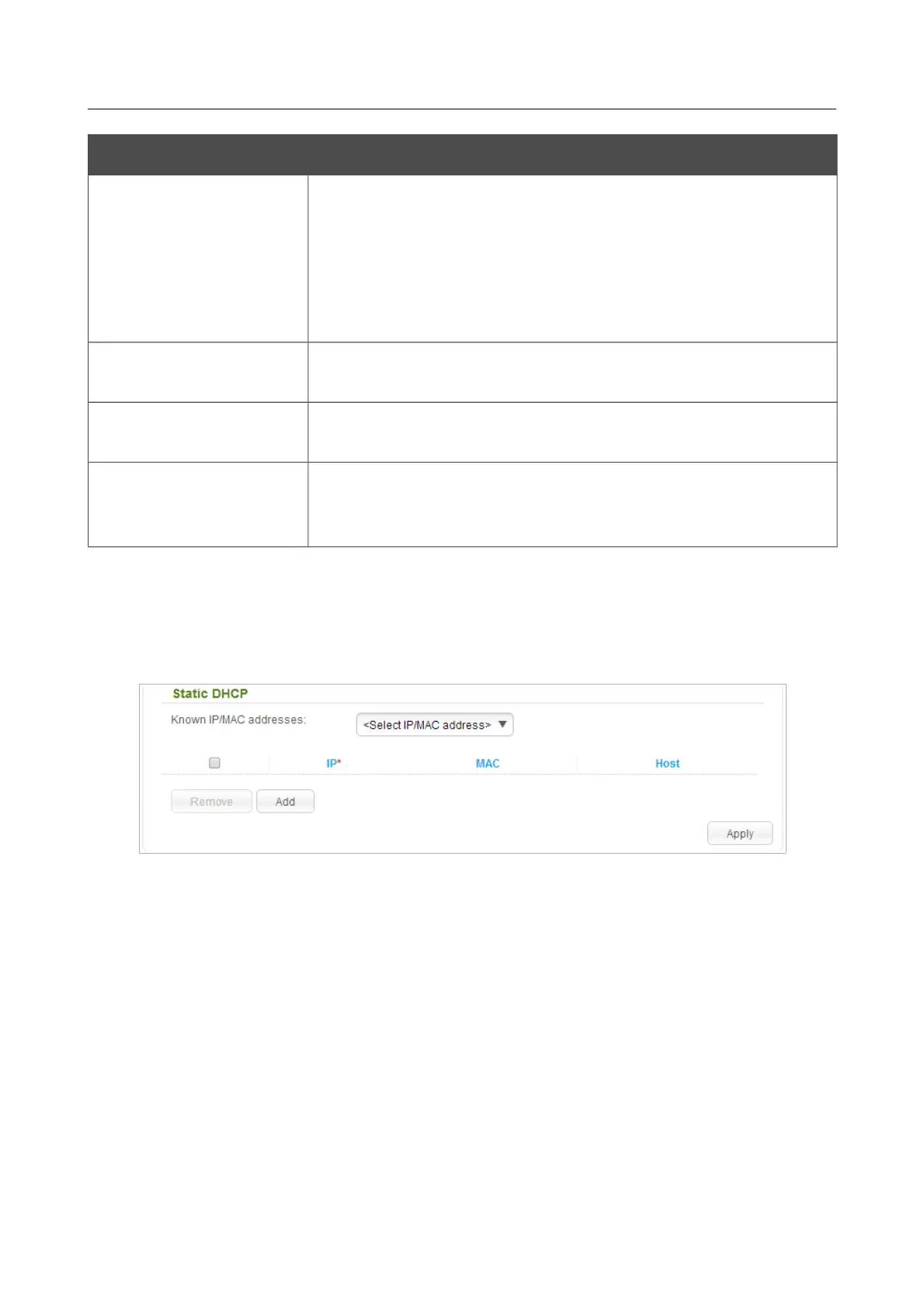 In the Static DHCP section, you can specify MAC address and IP address pairs (set a fixed IPv4