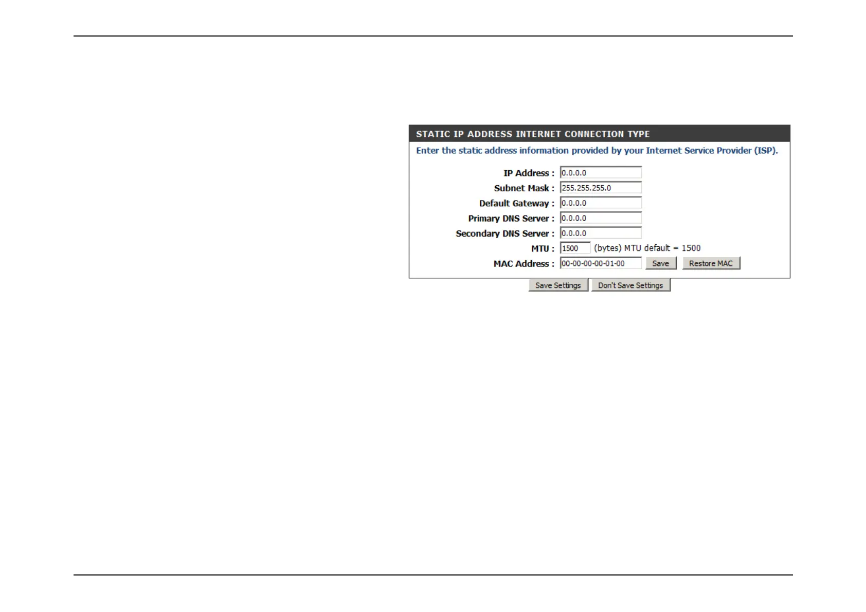 The default MAC Address is set to the Internet port’s physical interface MAC address on the Broadband Router.