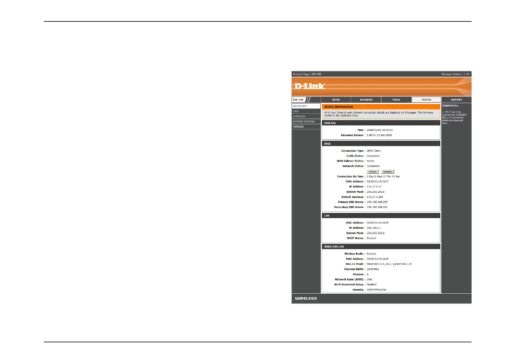 All of your Internet and network connection details are displayed on this page. The firmware version is also displayed here.