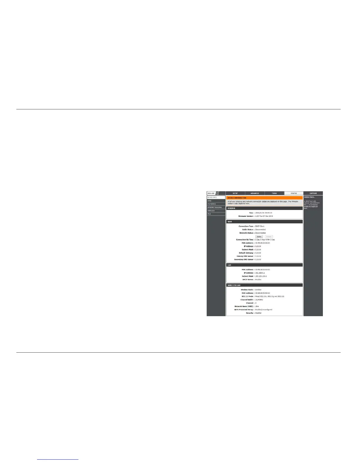 This page displays the current information for the DIR-600. It will display the LAN, WAN (Internet), and Wireless information. If