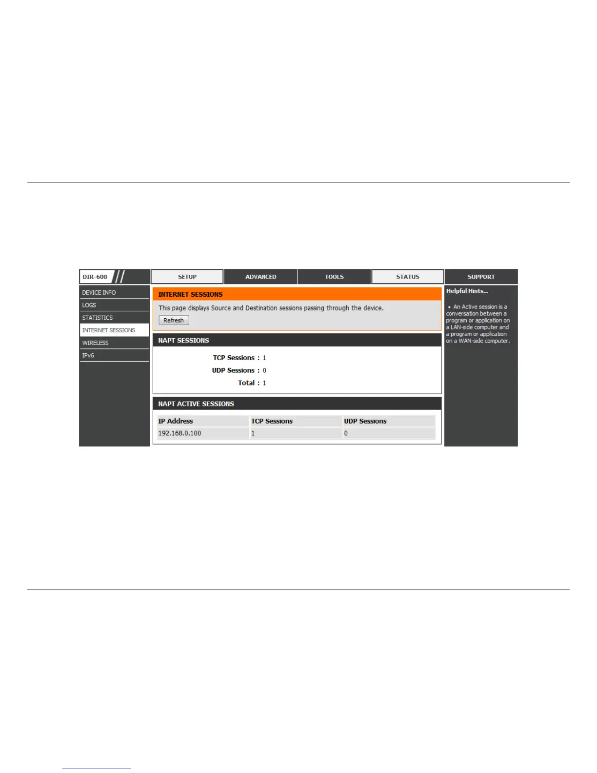 The Internet Sessions page displays full details of active Internet sessions through your router. An Internet session is a