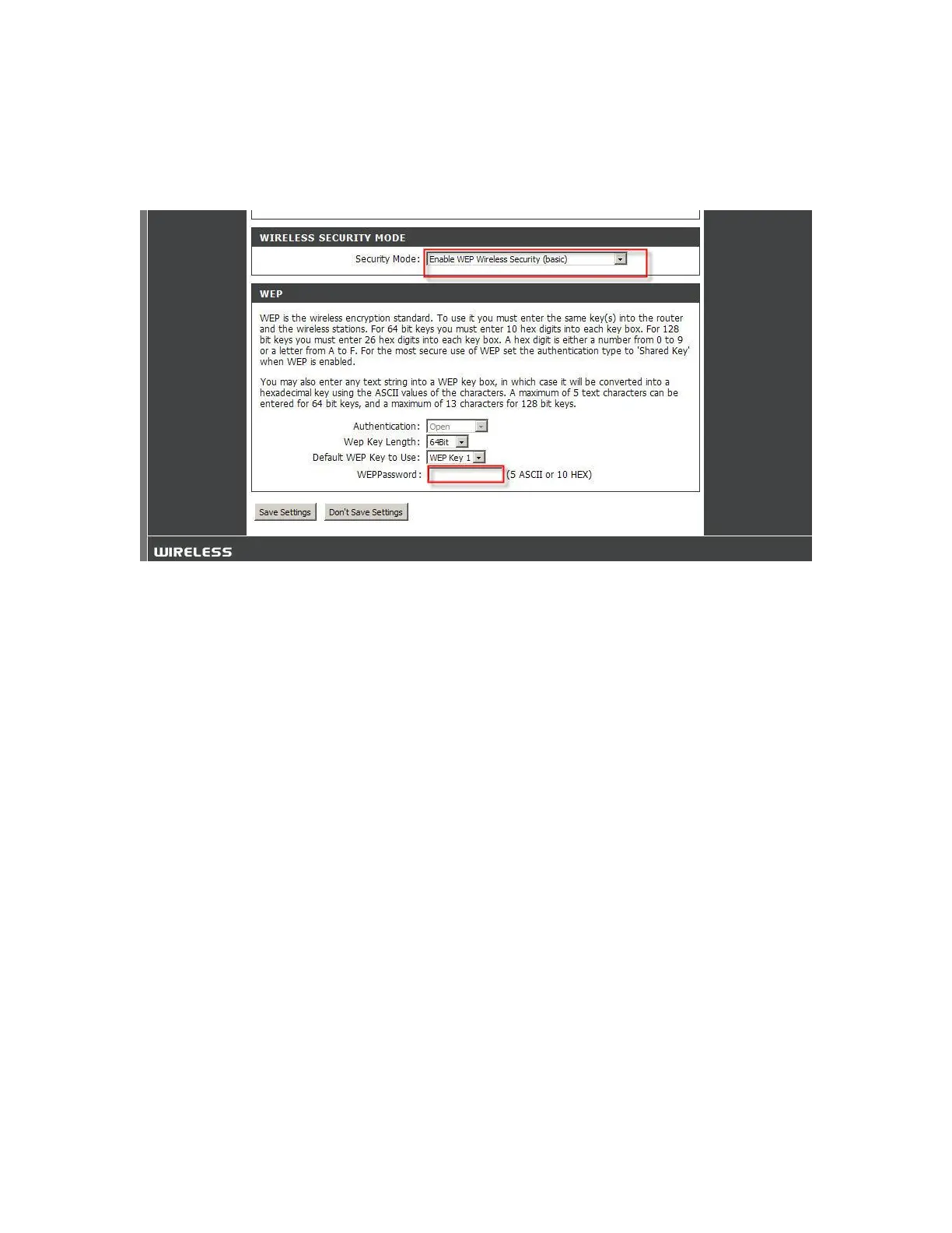 - Select Enable WEP Wireless Security (basic) on the Security mode on the drop