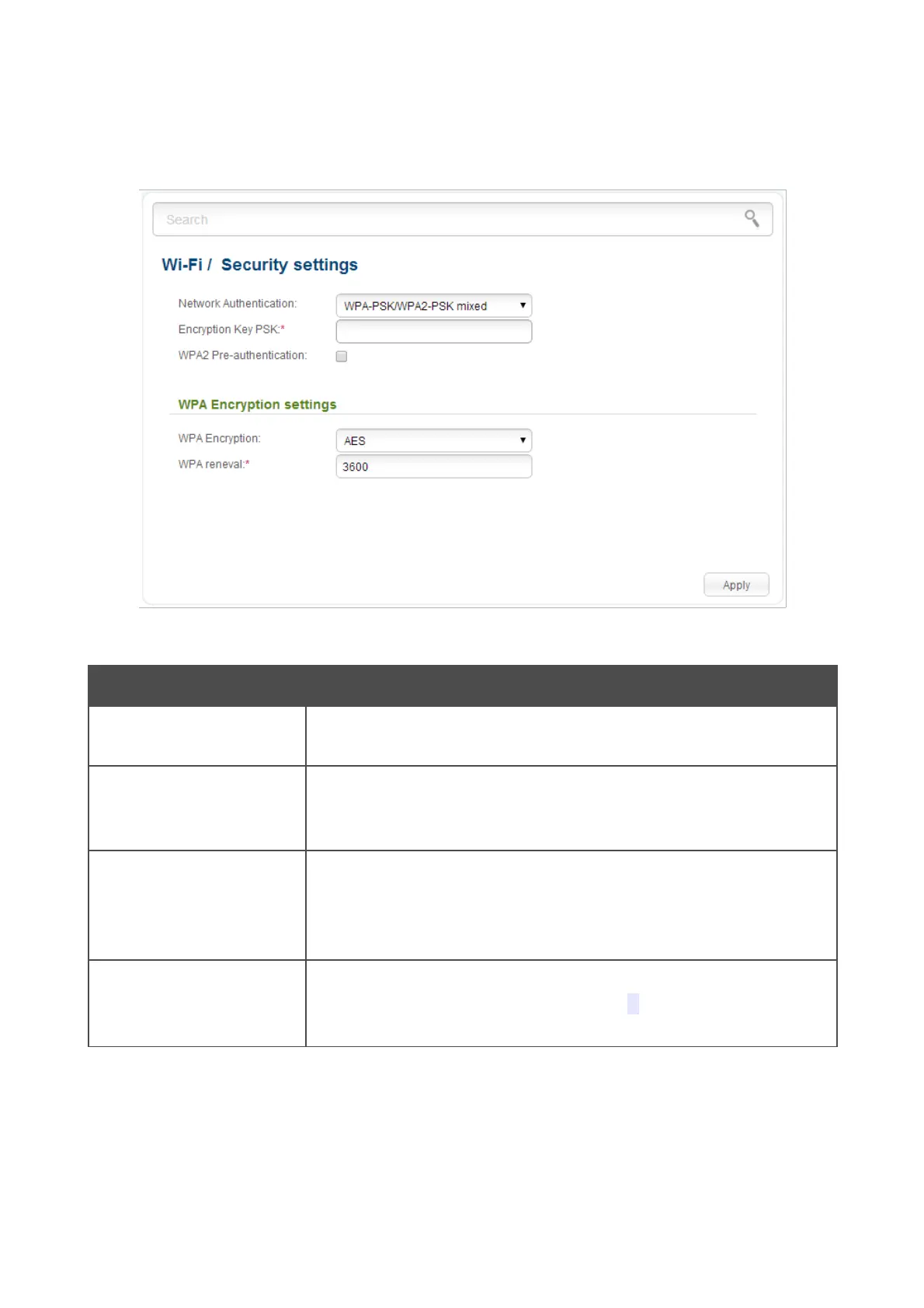 When the WPA-PSK, WPA2-PSK, or WPA-PSK/WPA2-PSK mixed value is selected, the