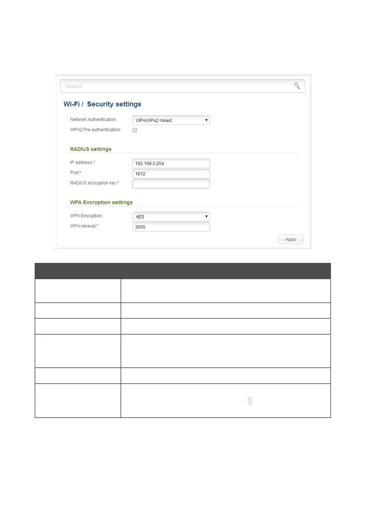 When the WPA, WPA2, or WPA/WPA2 mixed value is selected, the RADIUS settings and