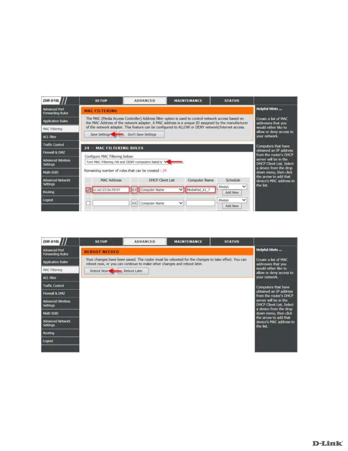  4 : Turn MAC Filtering ON and Deny computers listed to access the network from