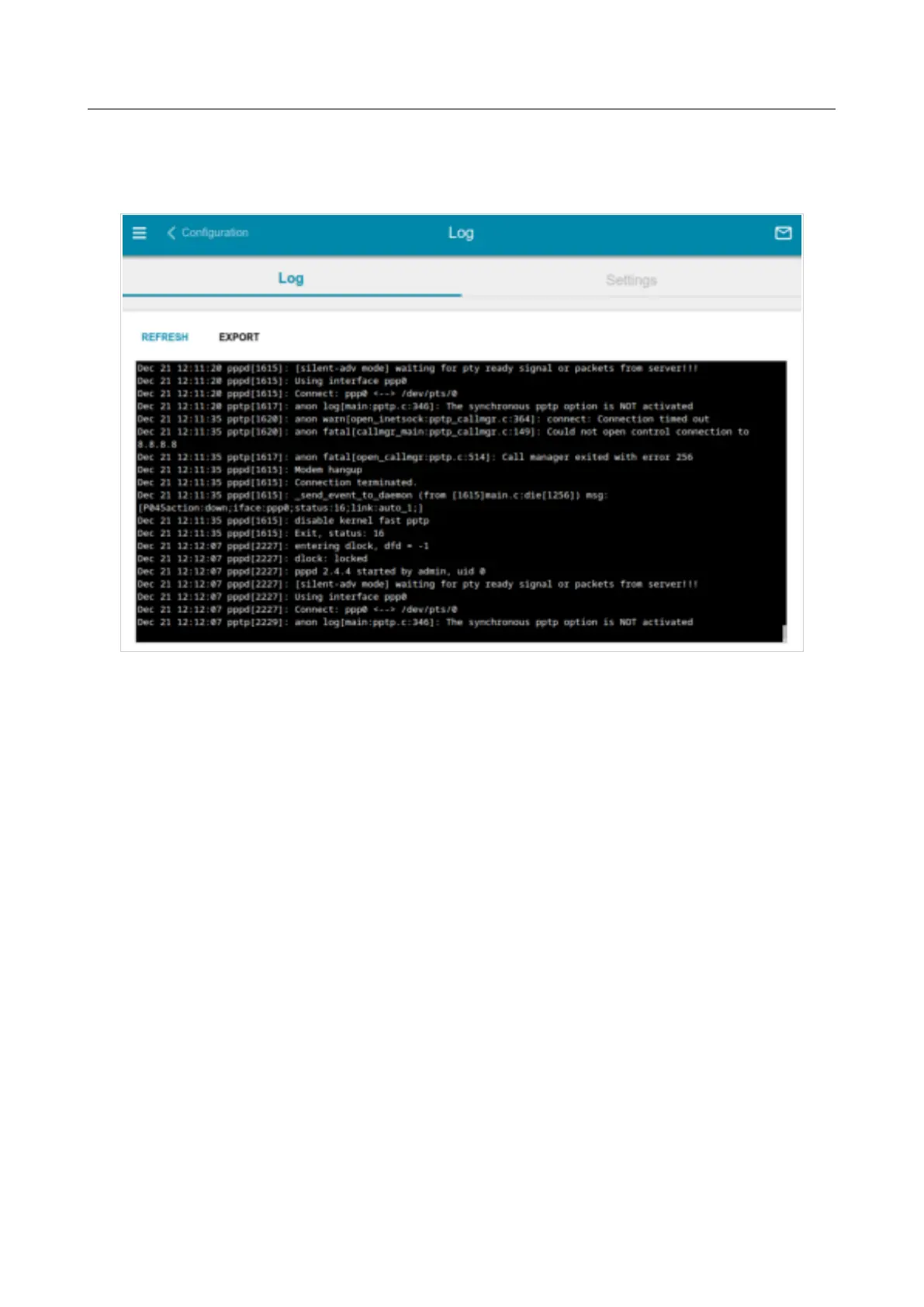 To save the system log to your PC, click the EXPORT button. The file will be stored in the