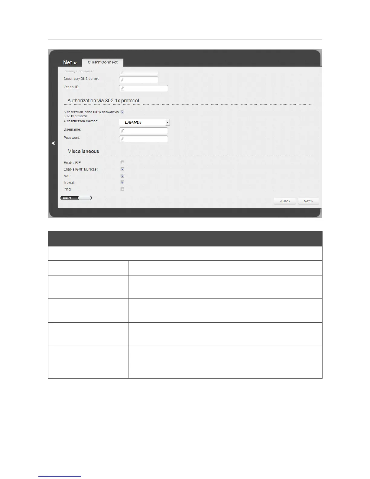 Figure 38. Configuring Dynamic IP WAN connection. The expert settings mode. The Miscellaneous section.