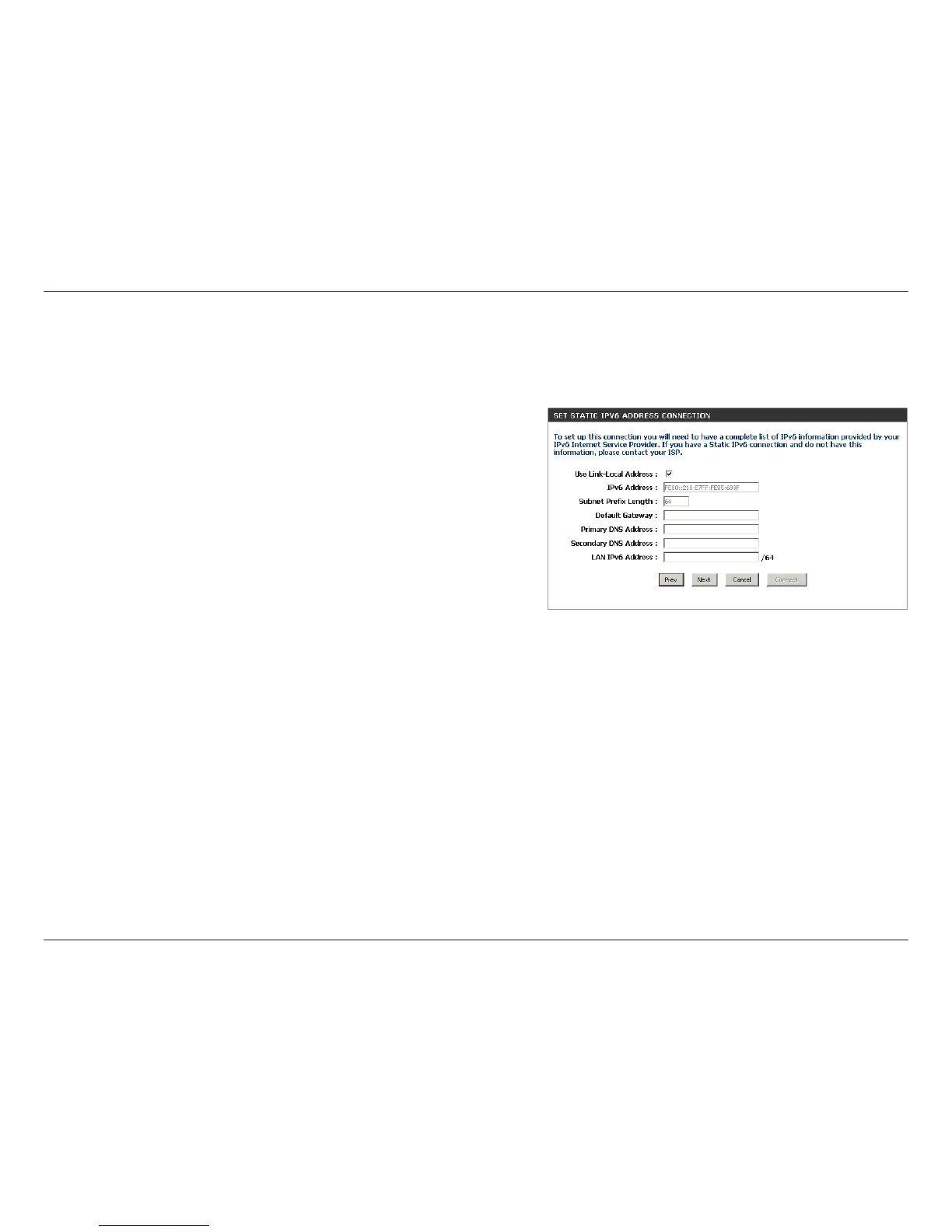IPv6 conguration settings. You must enter the IPv6 address, Subnet Prex Length, Default Gateway, Primary DNS Server, and Secondary DNS