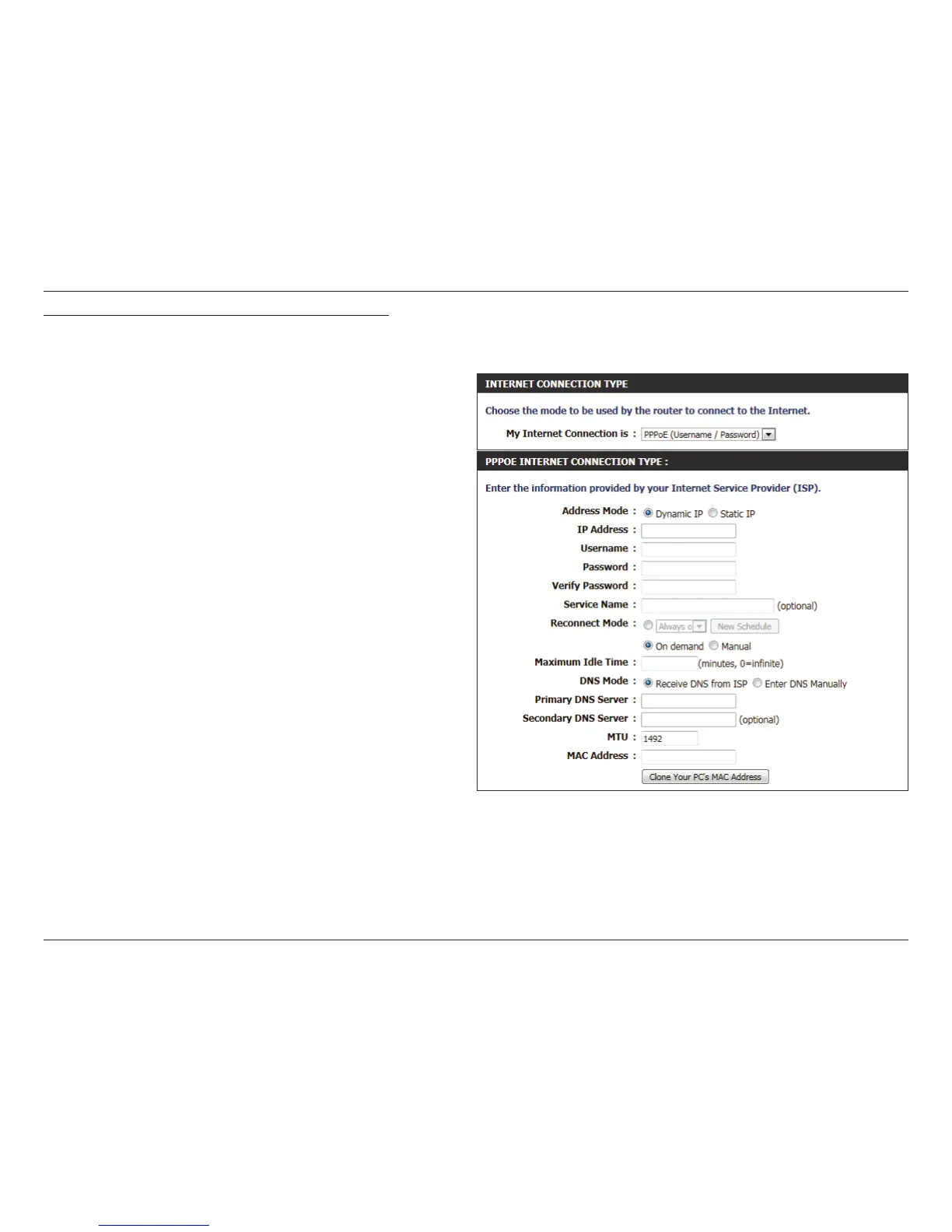 Another Internet Connection type is PPPoE. This option is typically used if you have a DSL Internet Connection. Make sure to remove the PPPoE