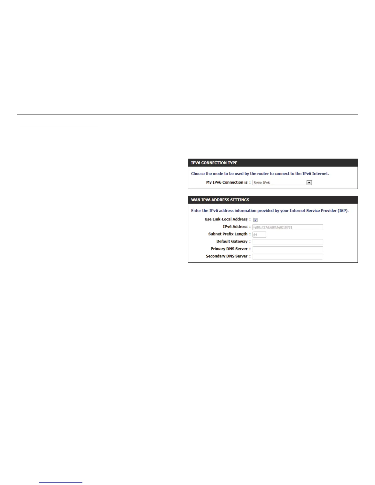 You must enter the IPv6 address, Subnet Prex Length, Default Gateway, Primary DNS Server, and Secondary DNS Server. Your ISP provides
