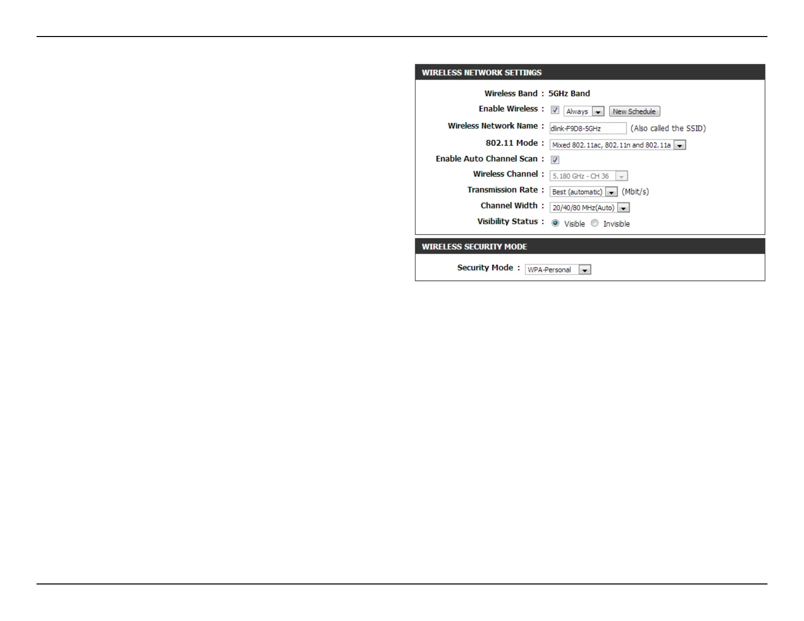 Wireless Channel: By default the channel is set to 36. The Channel can be changed to t the channel setting for an existing wireless
