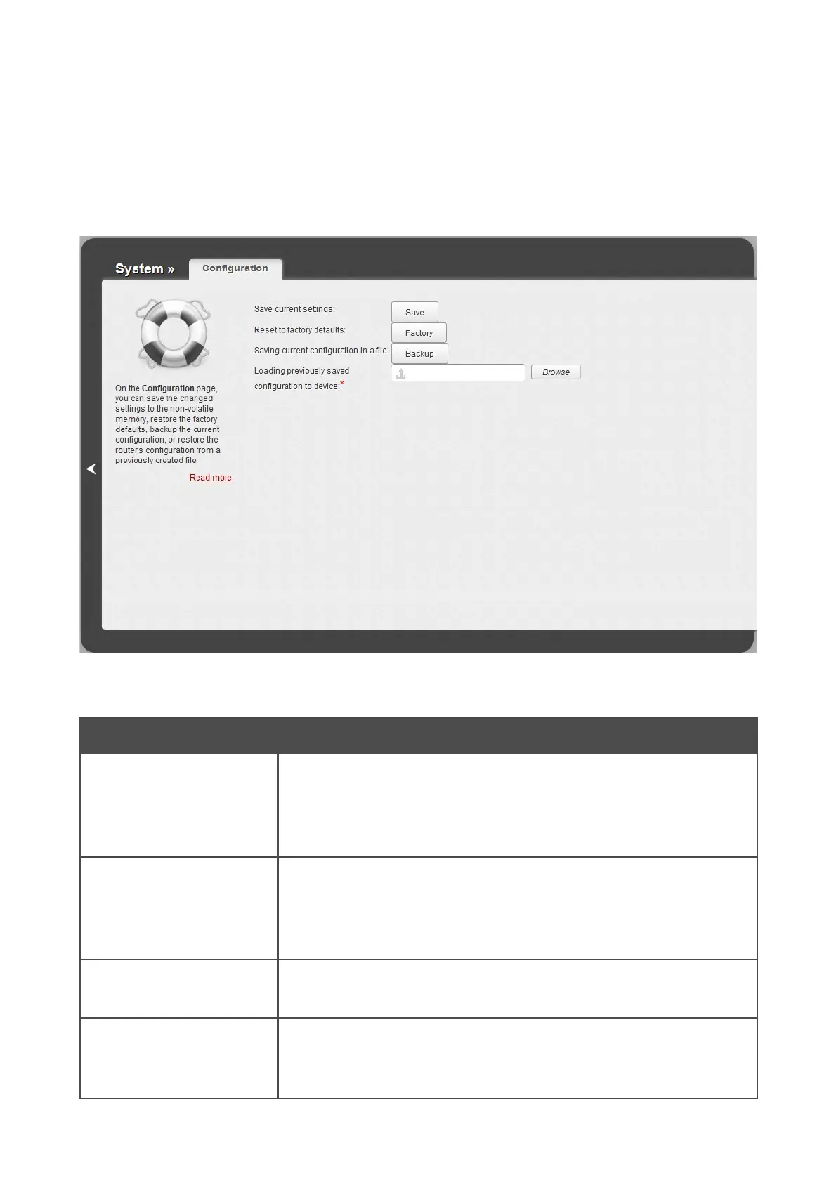 memory, restore the factory defaults, backup the current configuration, or restore the router's