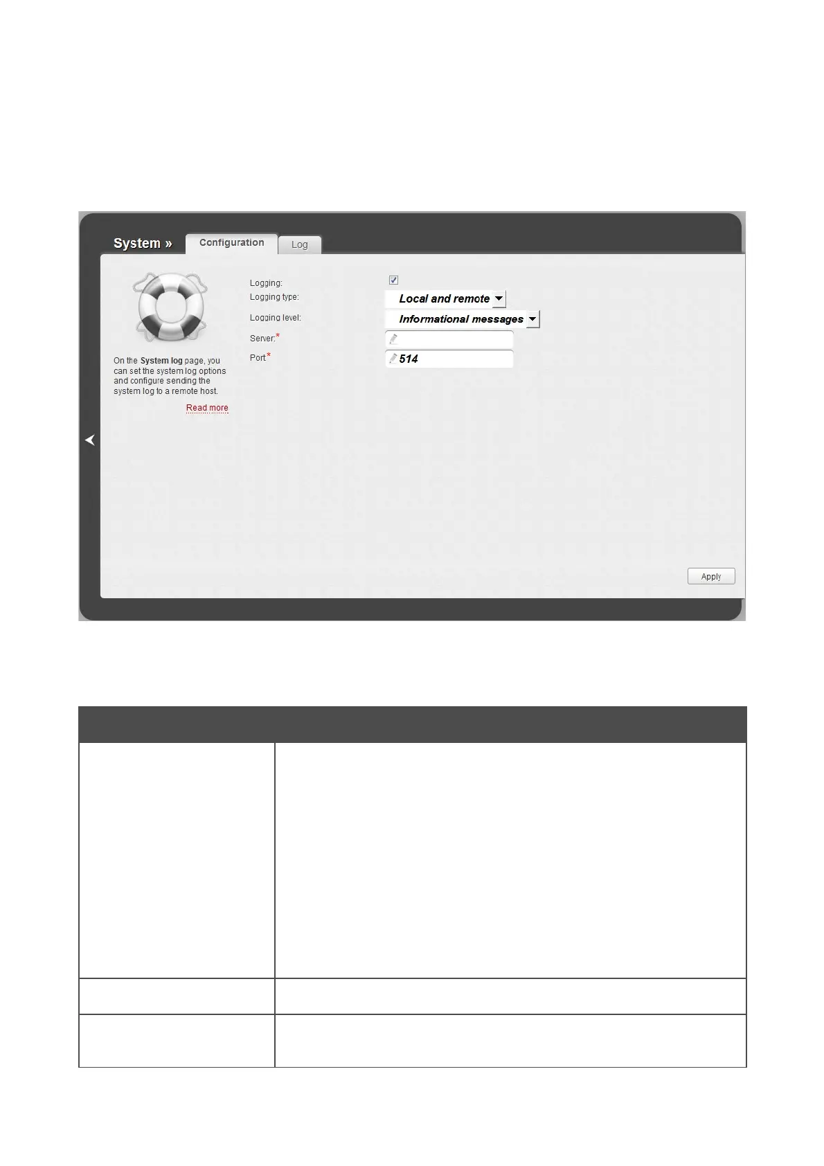 To enable logging of the system events, select the Logging checkbox on the Configuration tab.