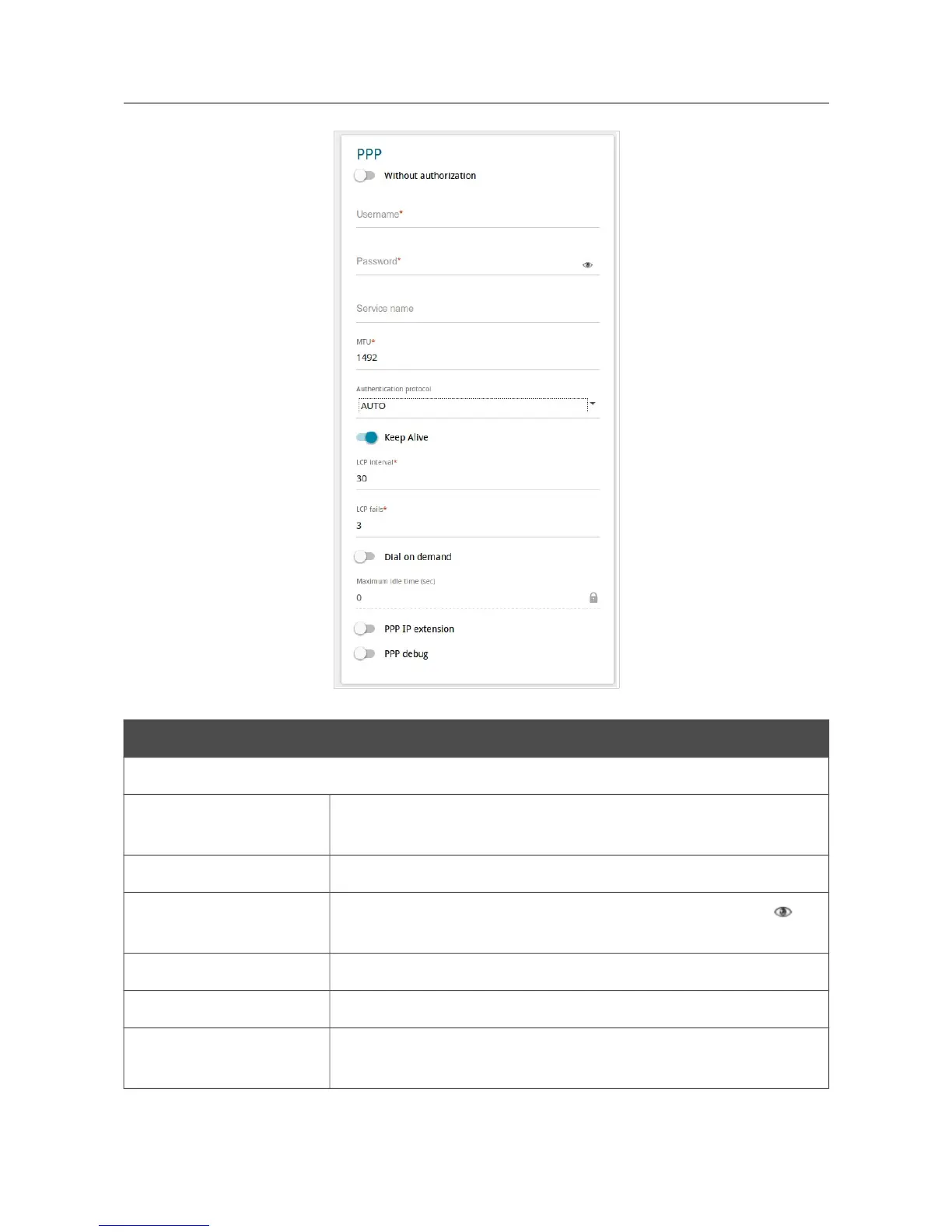 Service name The name of the PPPoE authentication server.