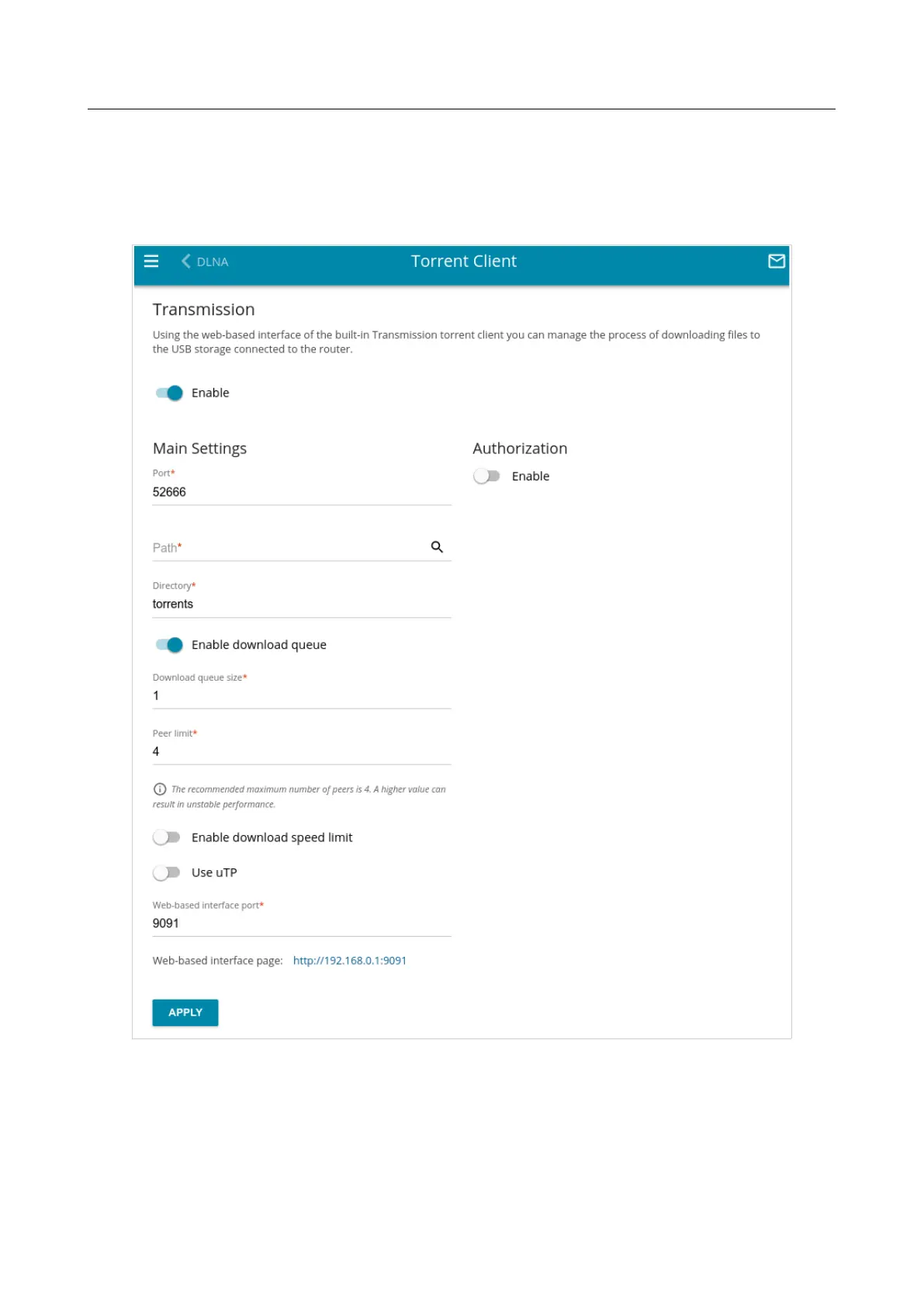 On the USB Storage / Torrent Client page, you can configure all needed settings for the built-in