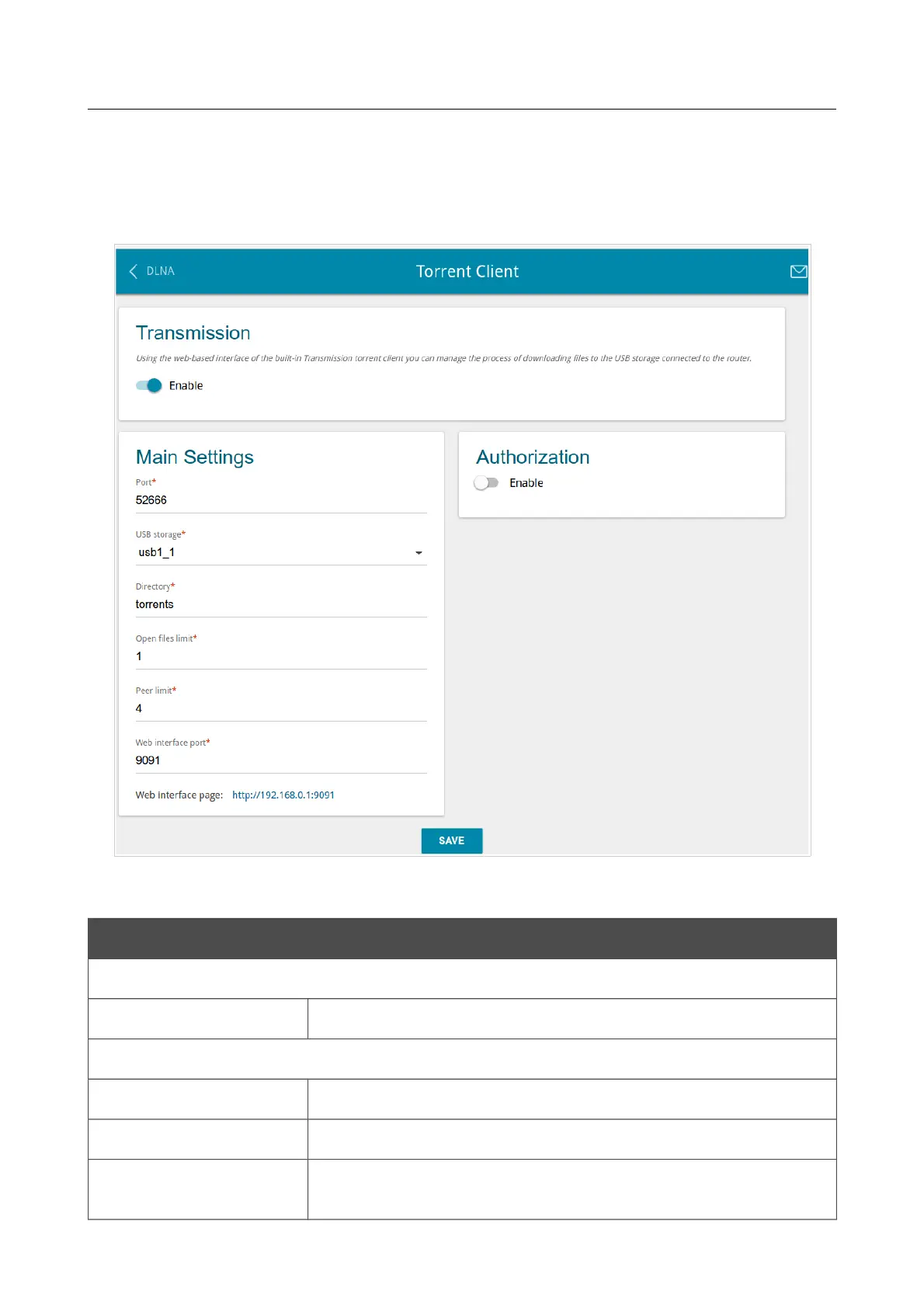 On the USB Storage / Torrent Client page, you can configure all needed settings for the built-in