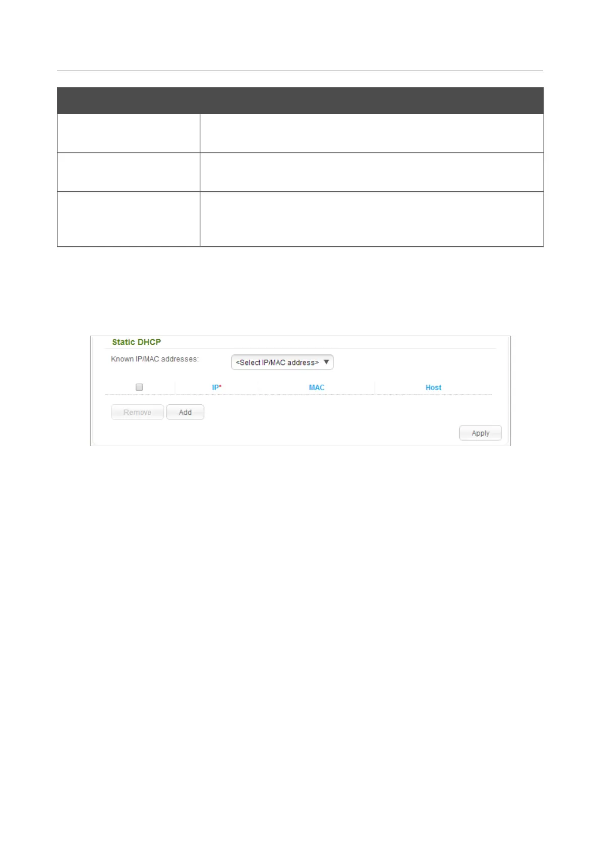 Existing MAC-IP pairs are displayed in the table of the Static DHCP section. To remove a pair,