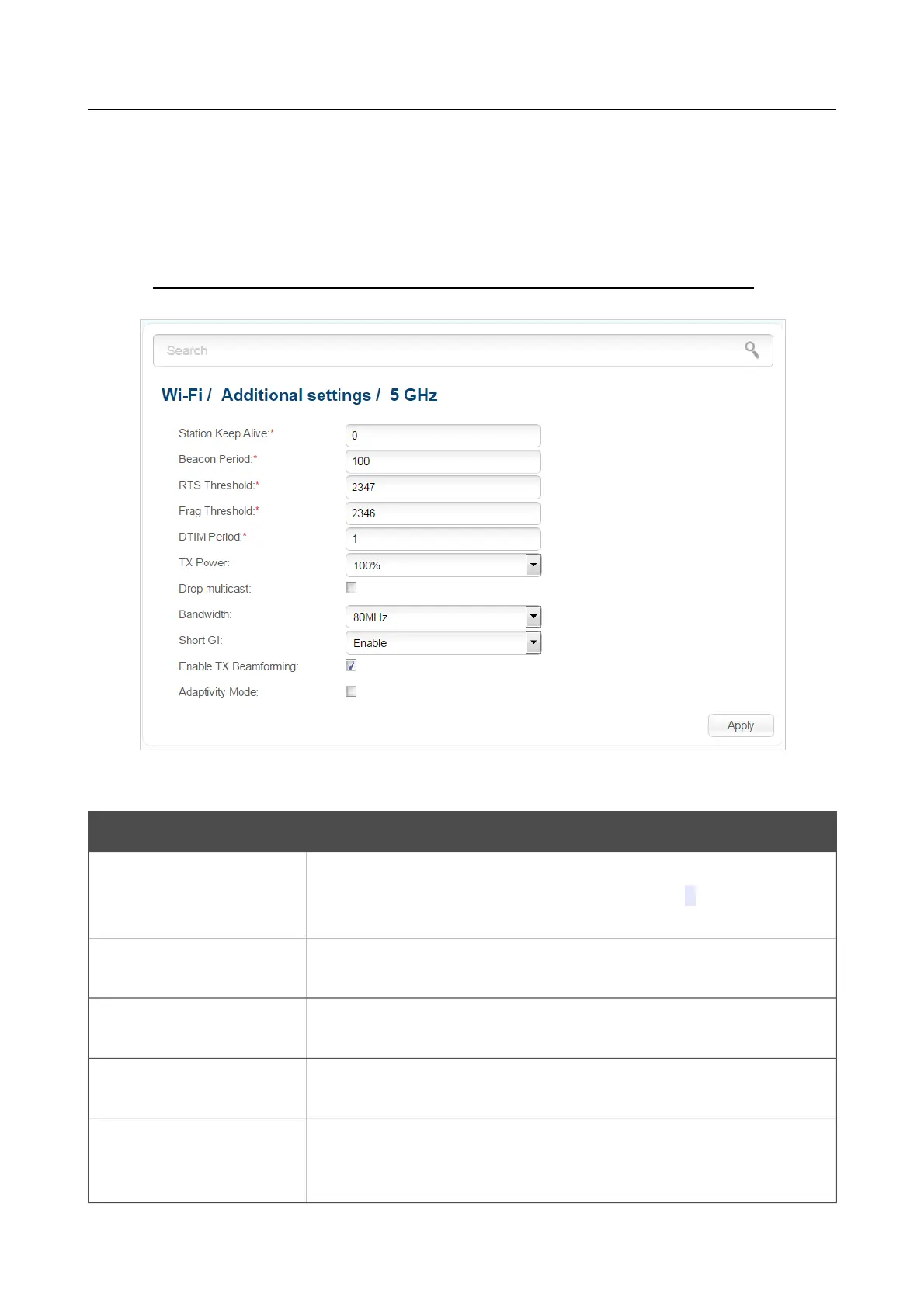 On pages of the Wi-Fi / Additional settings section, you can define additional parameters for the