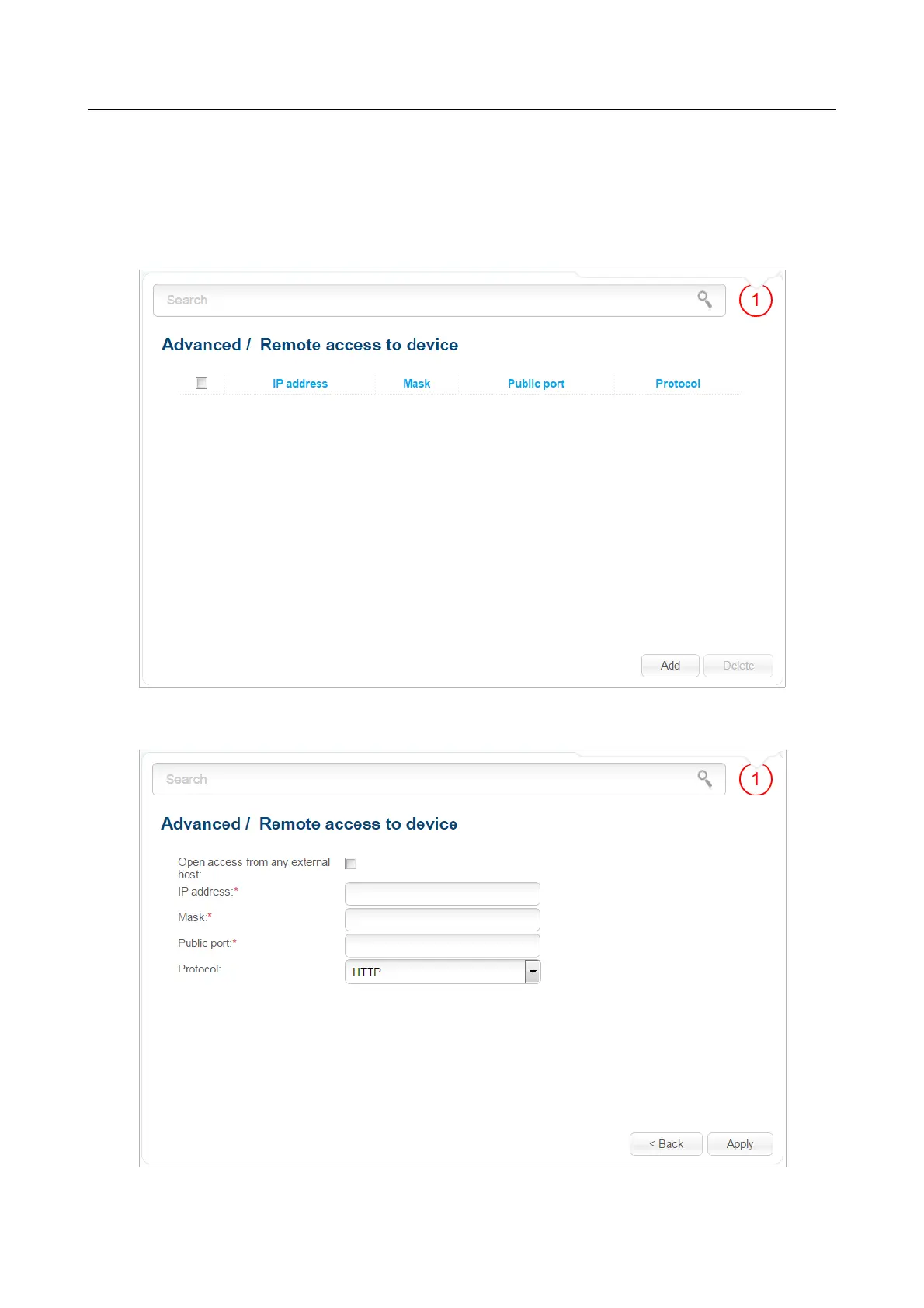 On the Advanced / Remote access to device page, you can configure access to the web-based