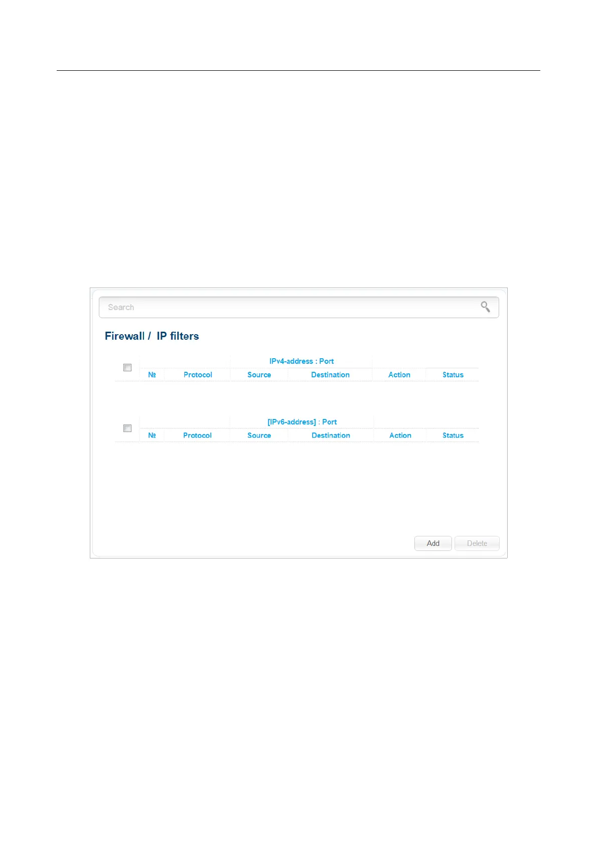 On the Firewall / IP filters page, you can create new rules for filtering IP packets and edit or