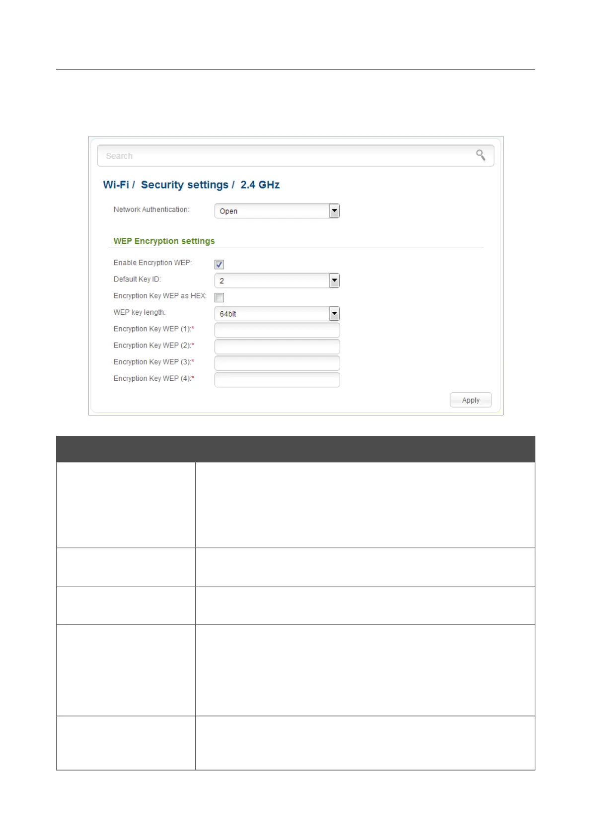 When the Open or Shared value is selected, the WEP Encryption settings section is displayed