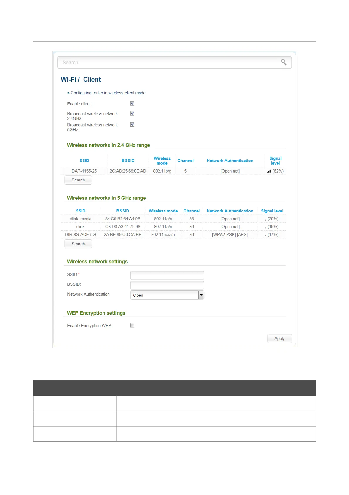 Figure 213. The page for configuring the client mode.