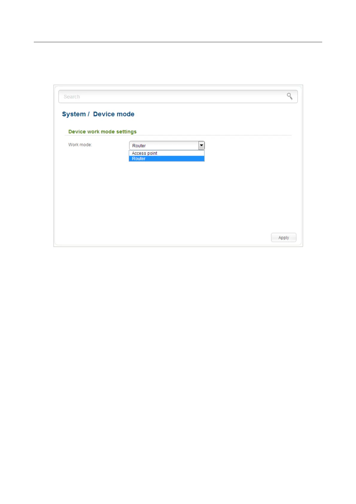 To switch the device to the other mode, select the Router value from the Work mode drop-down