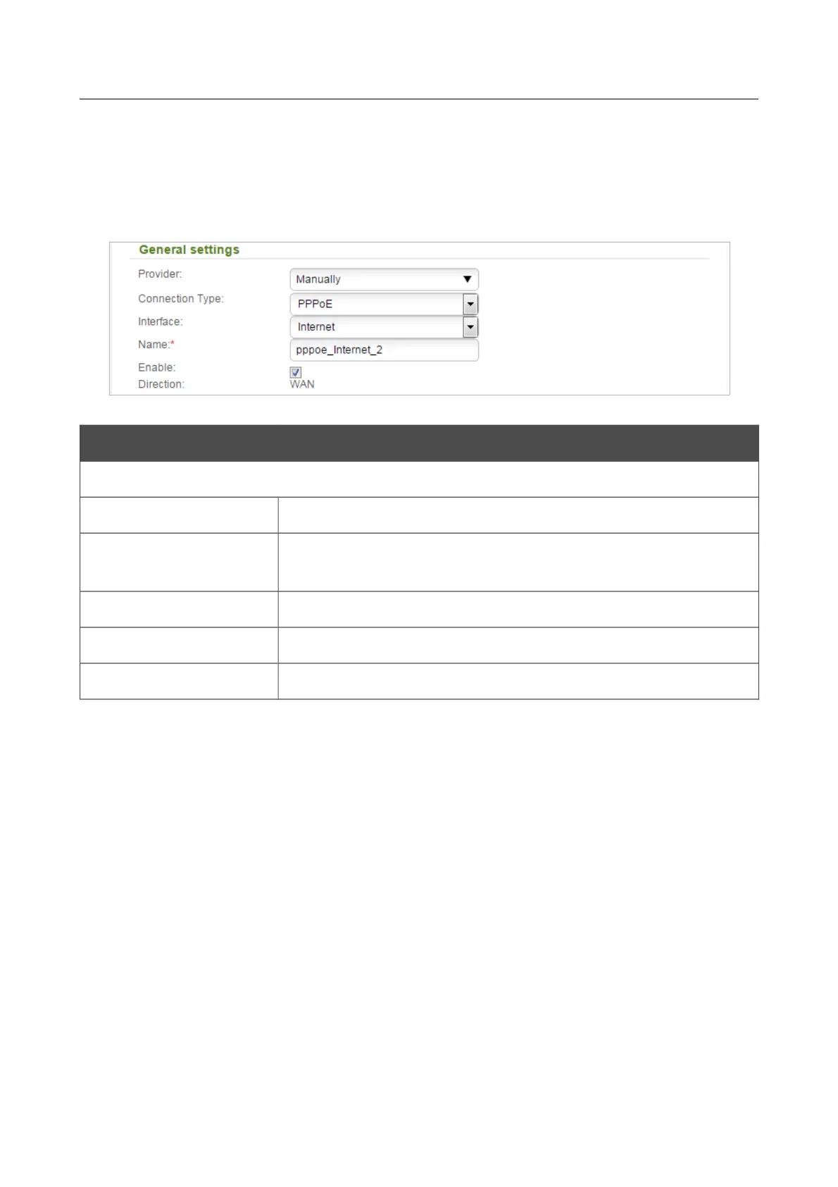 Figure 71. The page for creating a new PPPoE connection. The General settings section.