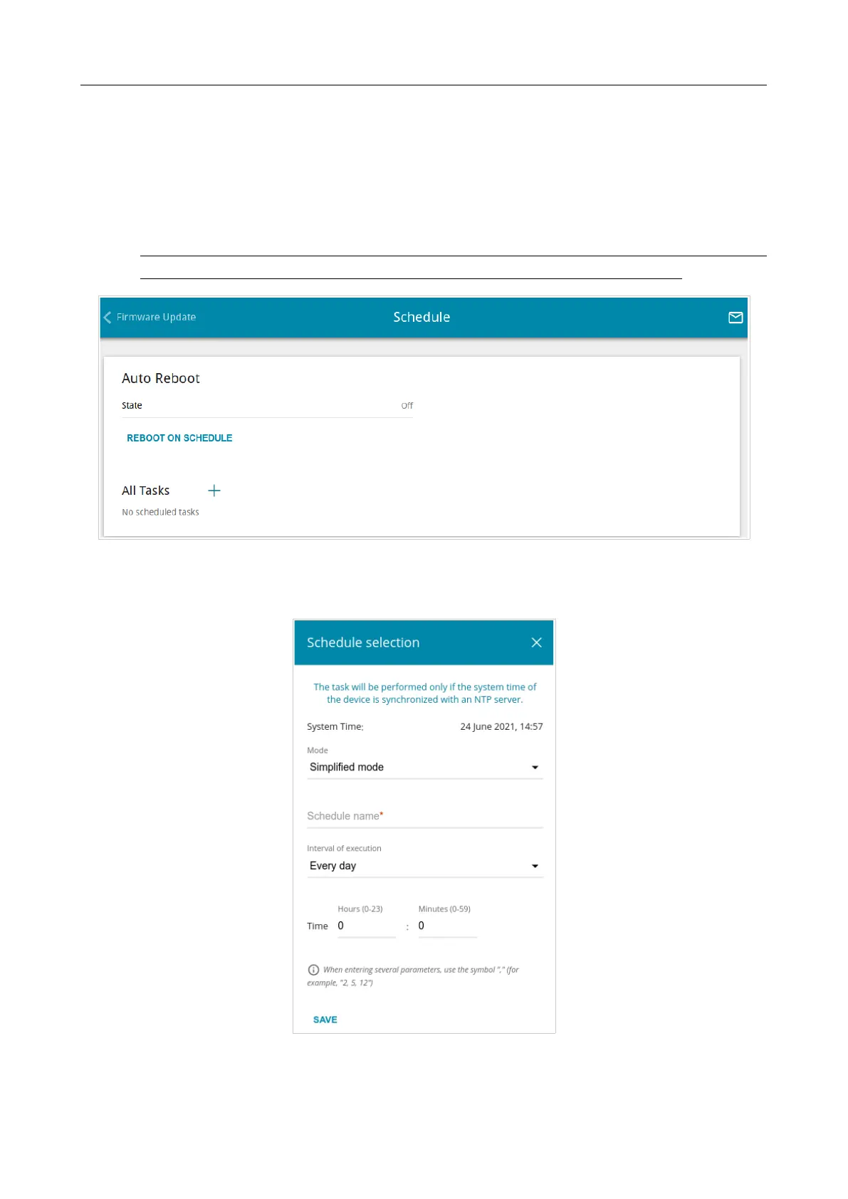 To configure automatic reboot of the device on a schedule, click the REBOOT ON SCHEDULE