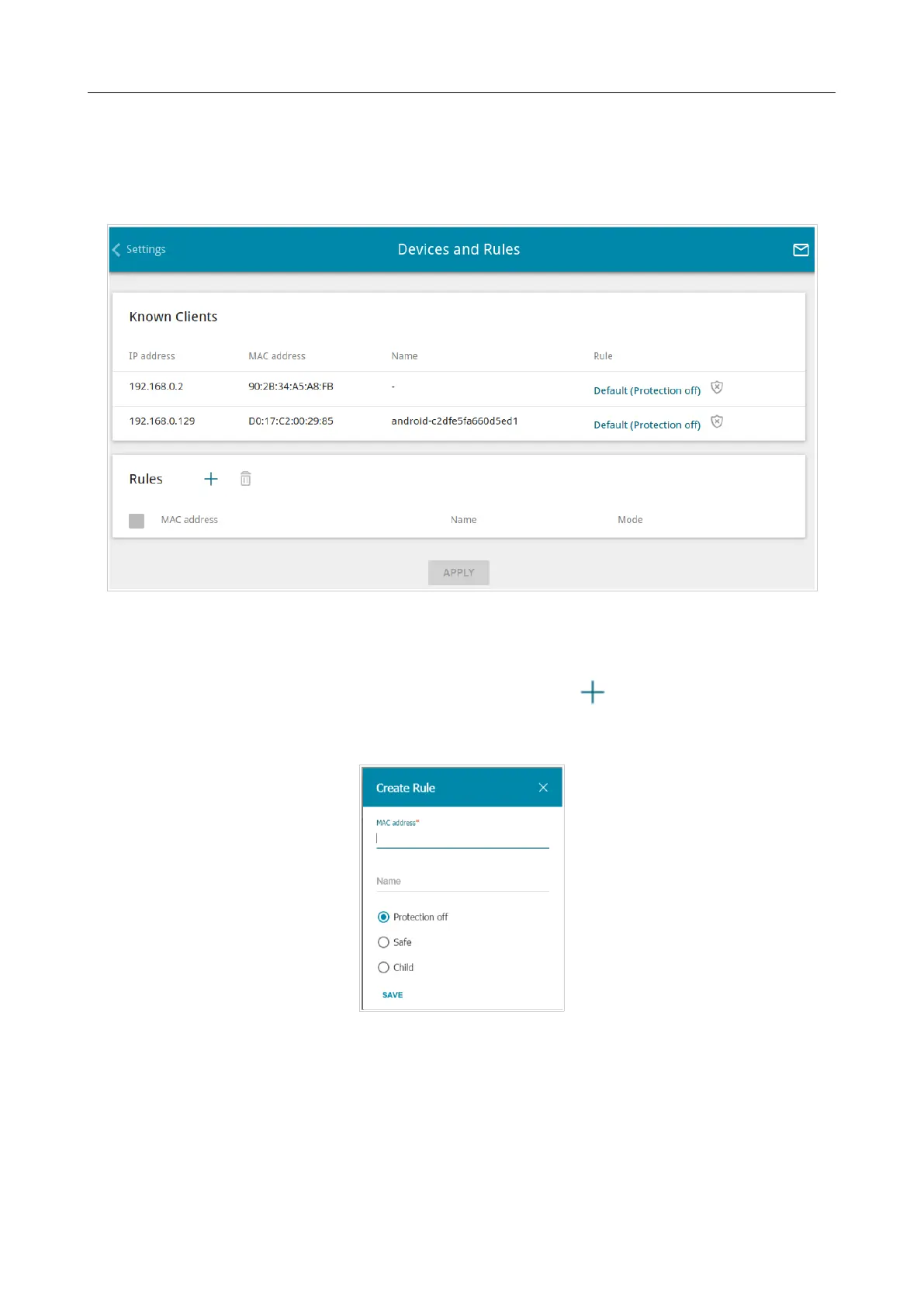 To create a new filtering rule for a device, click the ADD button ( ) in the Rules section, or left-