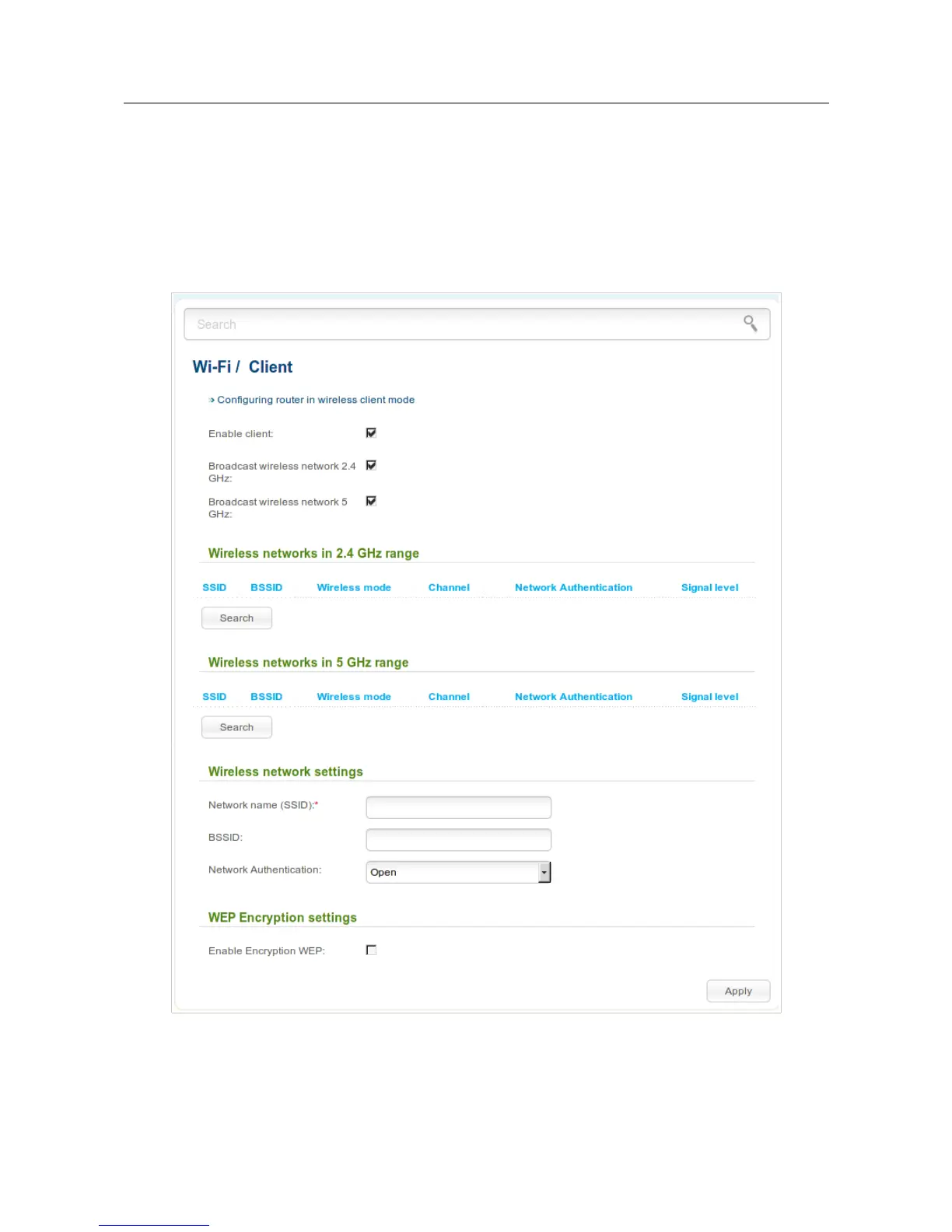 On the Wi-Fi / Client page, you can configure the router as a client to connect to a wireless access