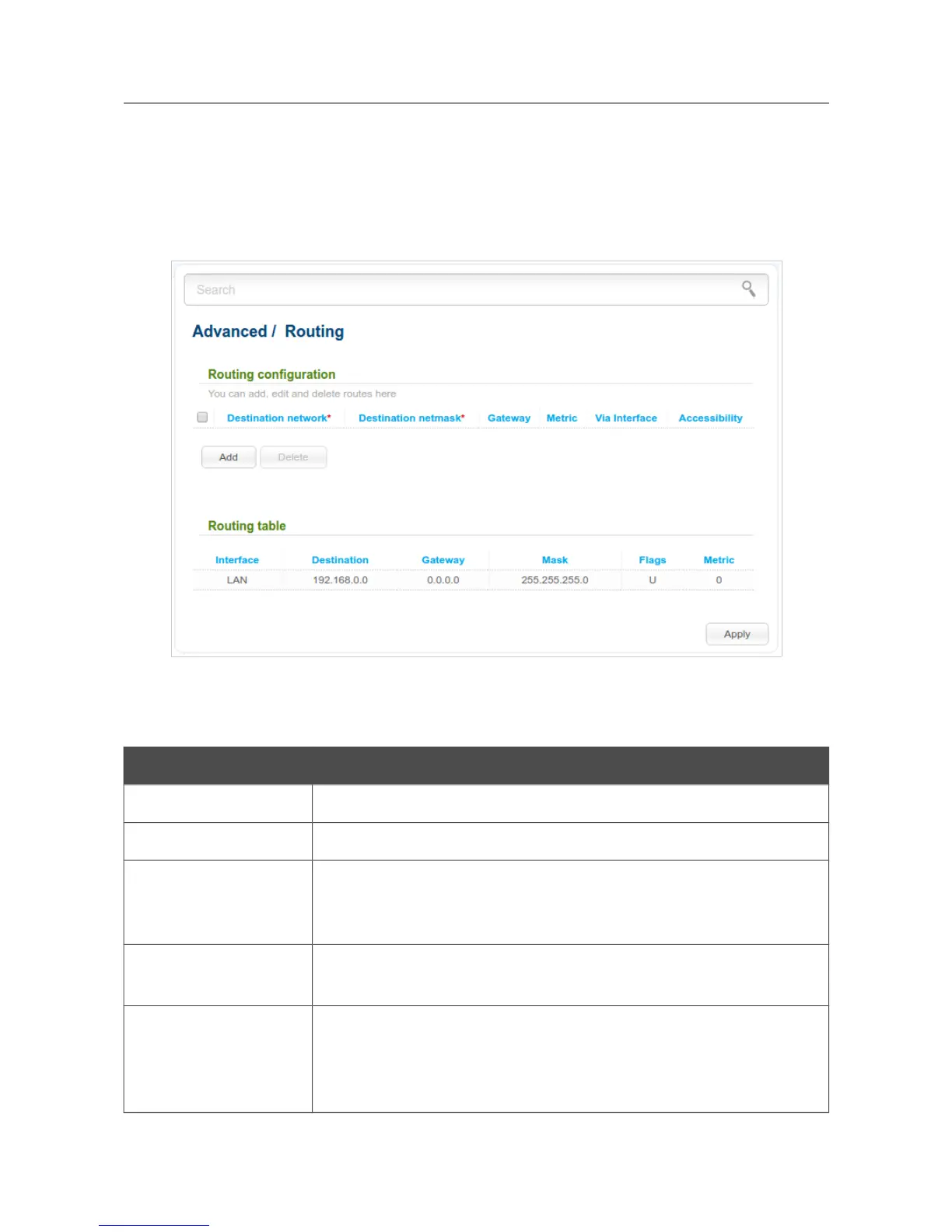 To create a new route, click the Add button. In the line displayed, you can specify the following