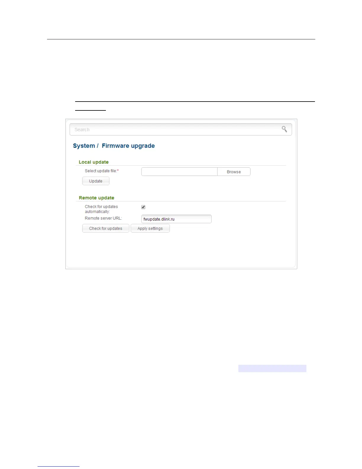 in the Remote server URL field, the D-Link update server address (fwupdate.dlink.ru) is