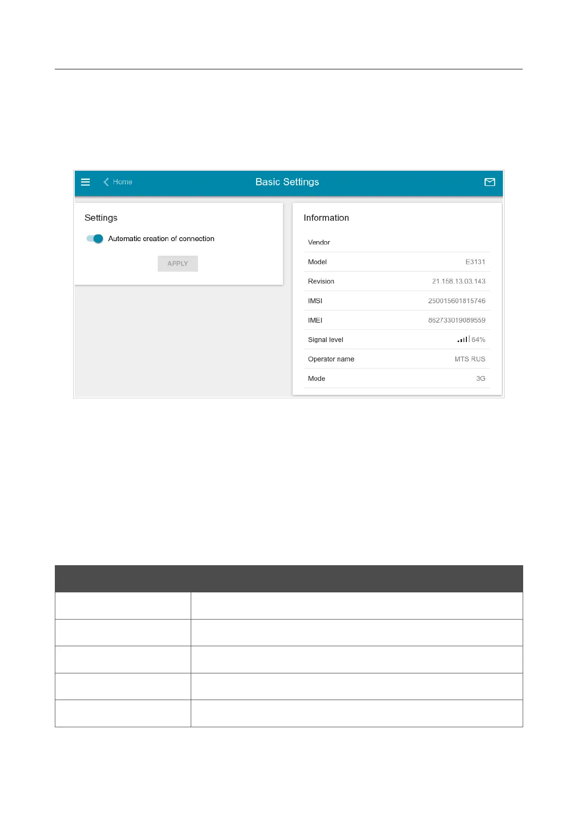 On the USB Modem / Basic Settings page, you can view data on the USB modem connected to