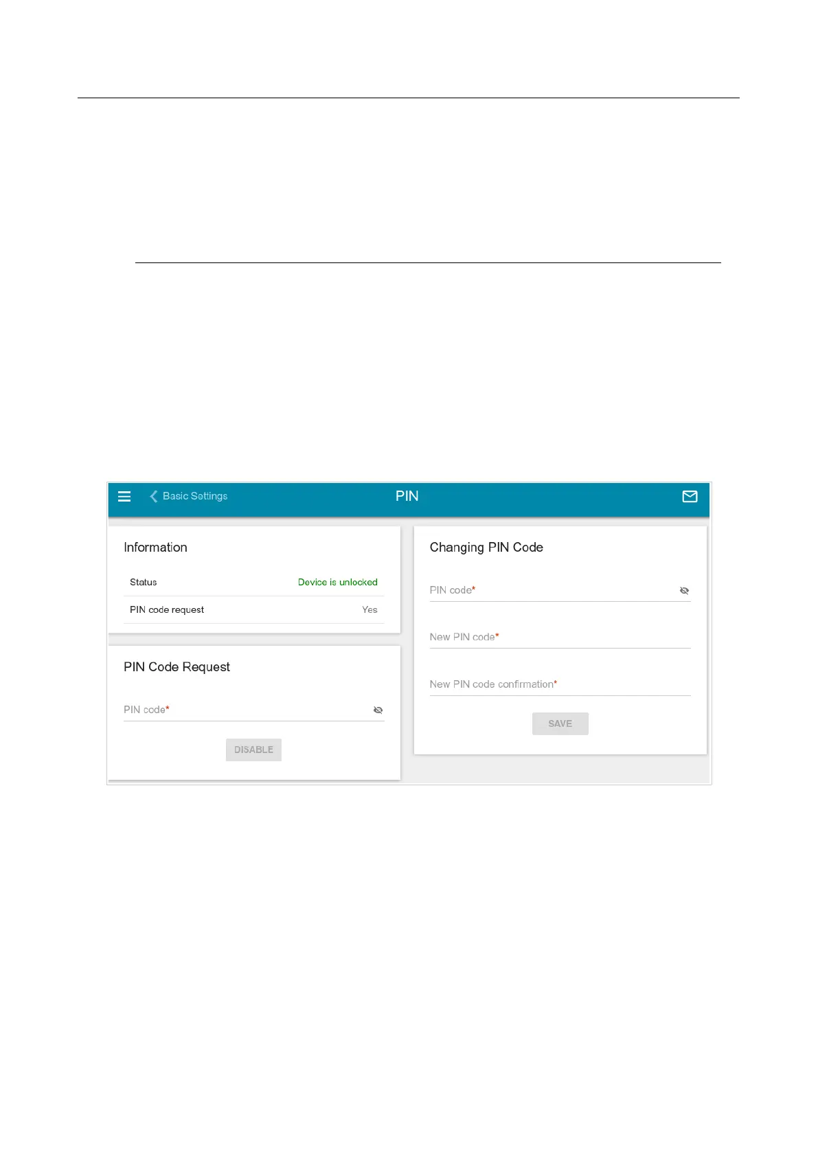 To disable the PIN code check, in the PIN Code Request section, enter the current PIN code in