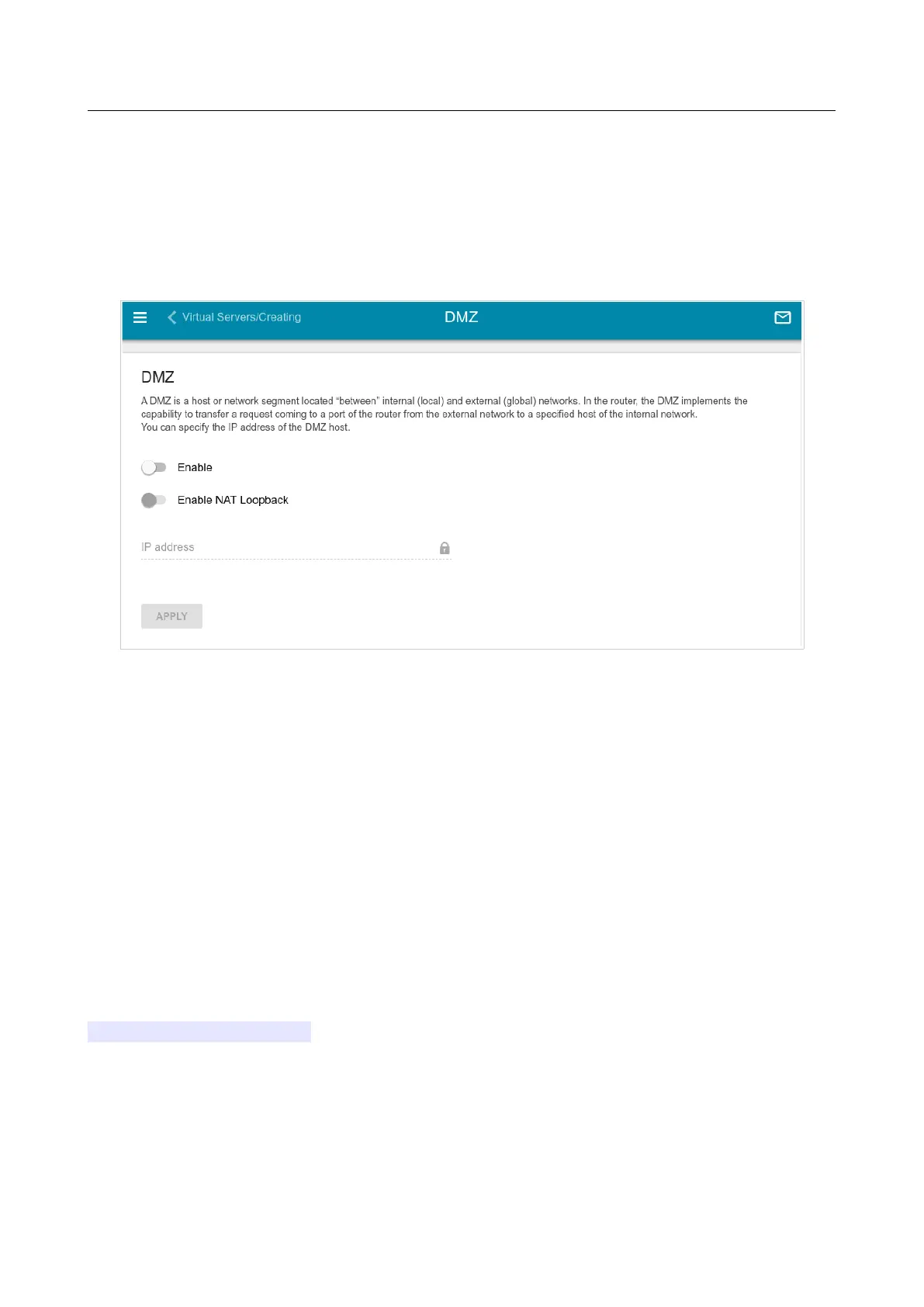 To disable the DMZ, move the Enable switch to the left and click the APPLY button.