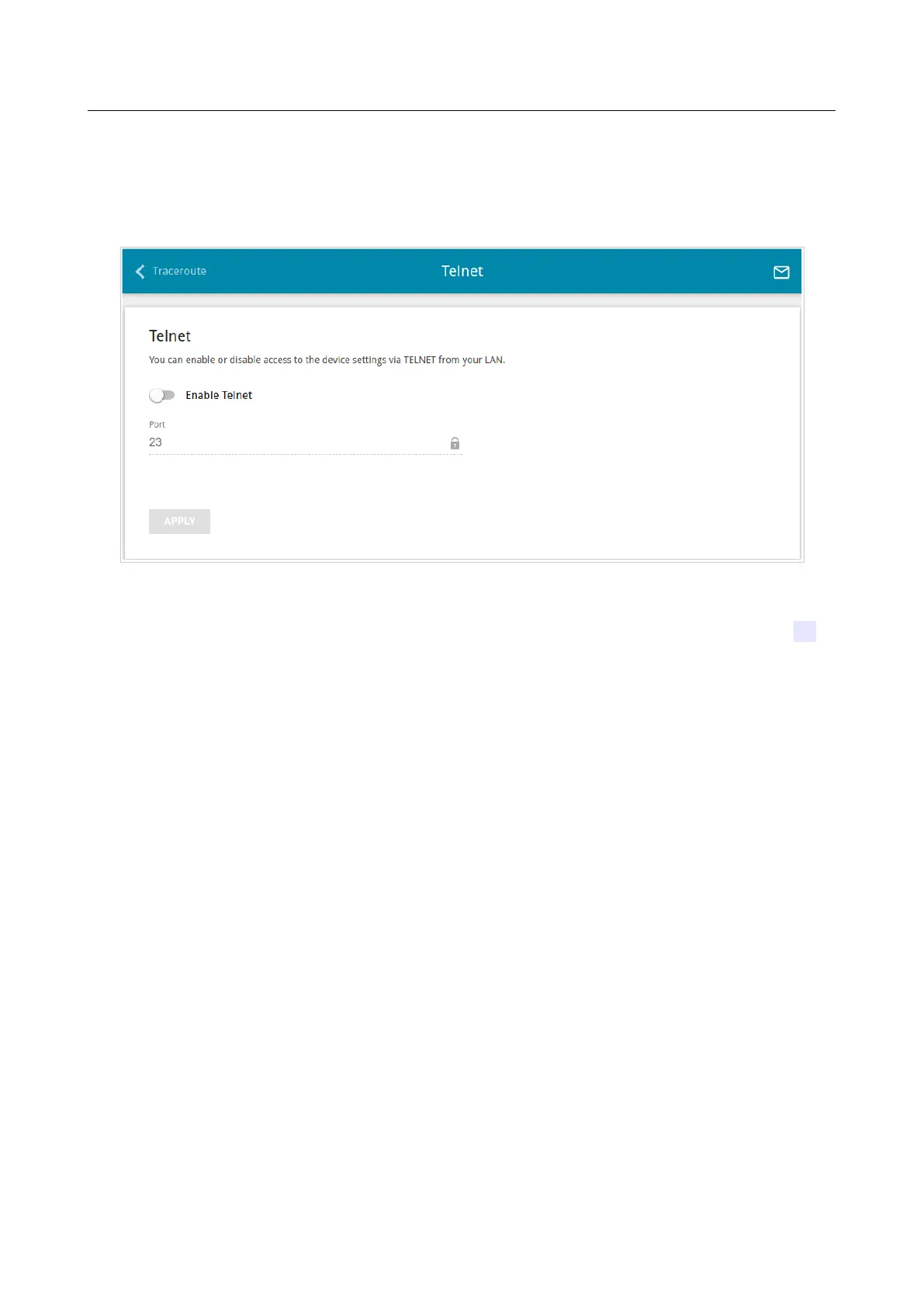 To disable access via TELNET again, move the Enable Telnet switch to the left and click the