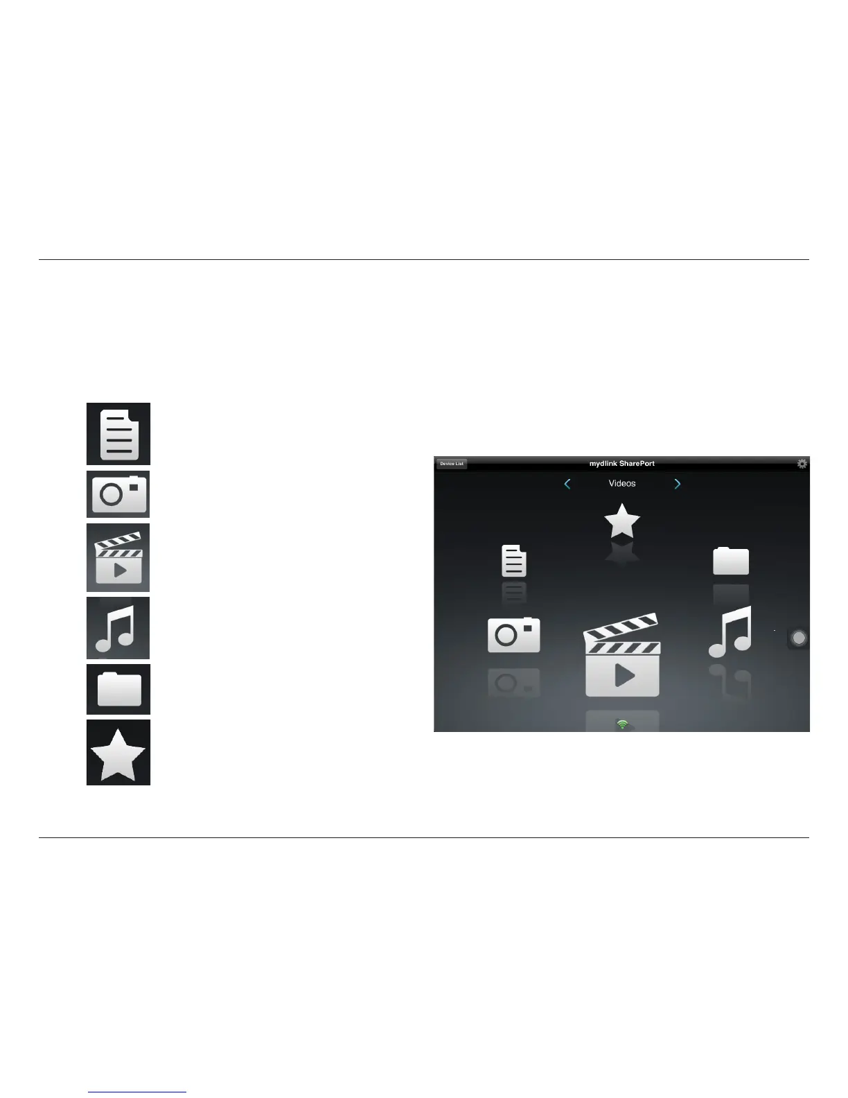 The mydlink SharePort main menu has dierent sections that let you see all the documents, photos, movies, or music stored