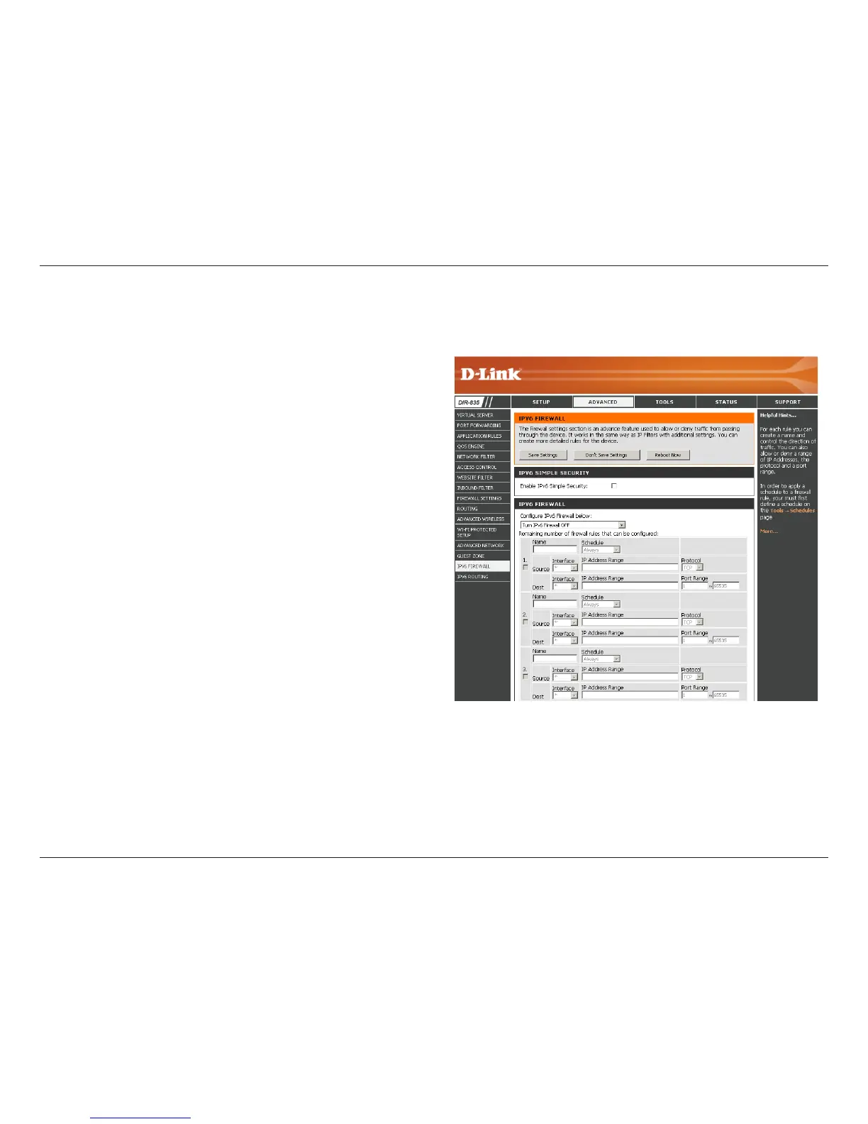 DIR-835’s IPv6 Firewall functions in a similar way to the IP Filters feature.