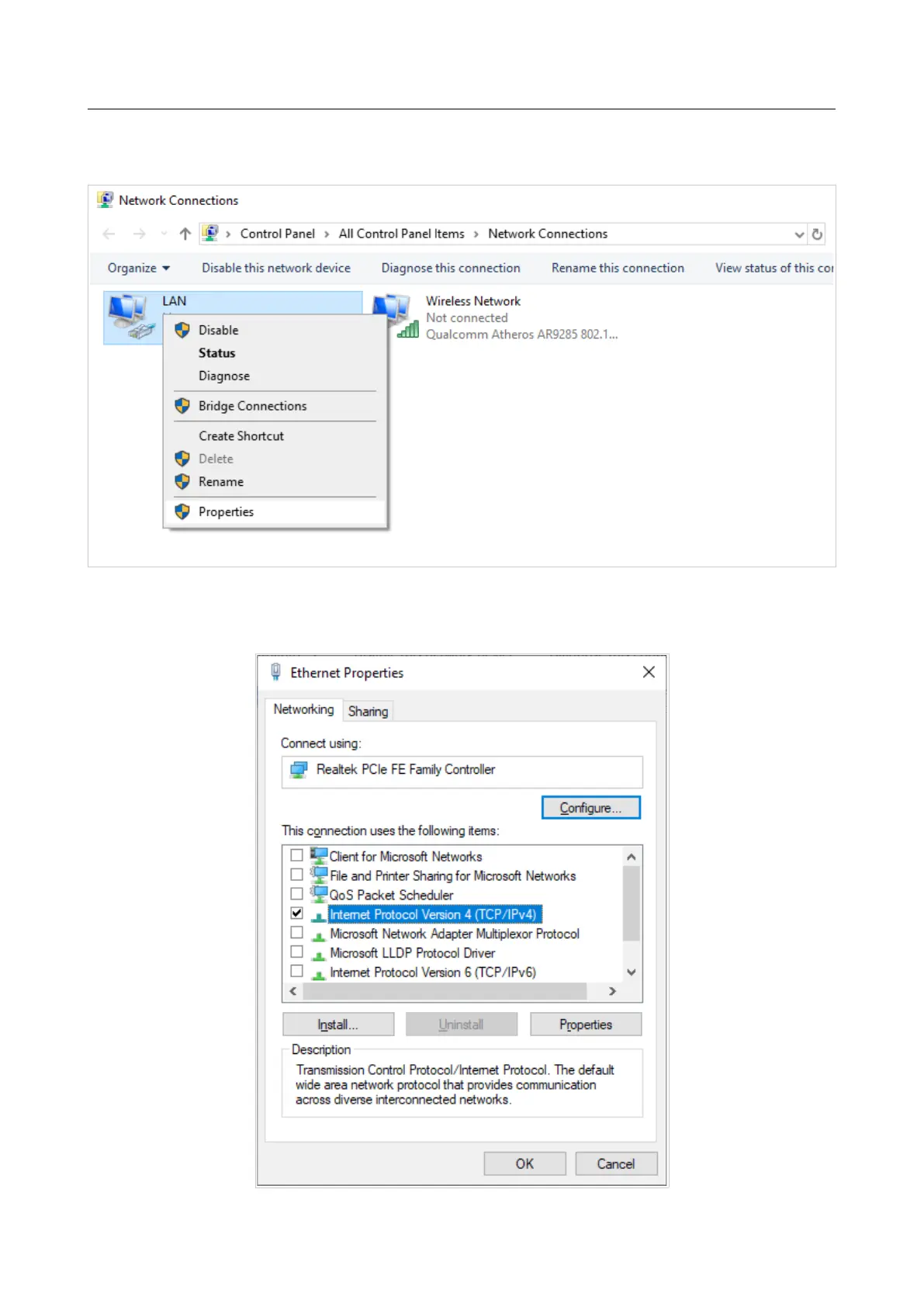4. In the opened window, right-click the relevant Local Area Connection icon and select