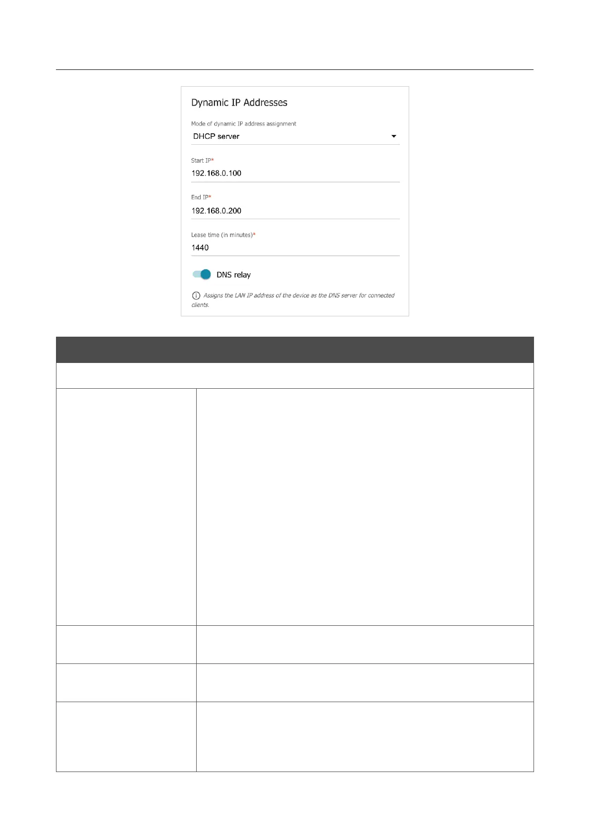 The lifetime of IP addresses leased by the DHCP server. At the end