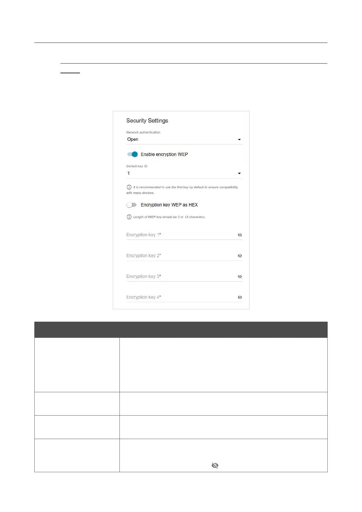 When the Open or WEP value is selected, the following settings are displayed on the page