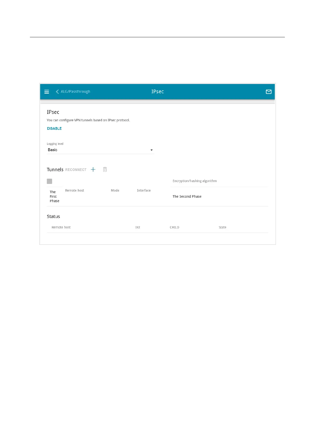 To allow IPsec tunnels, click the ENABLE button. Upon that the Tunnels and Status sections