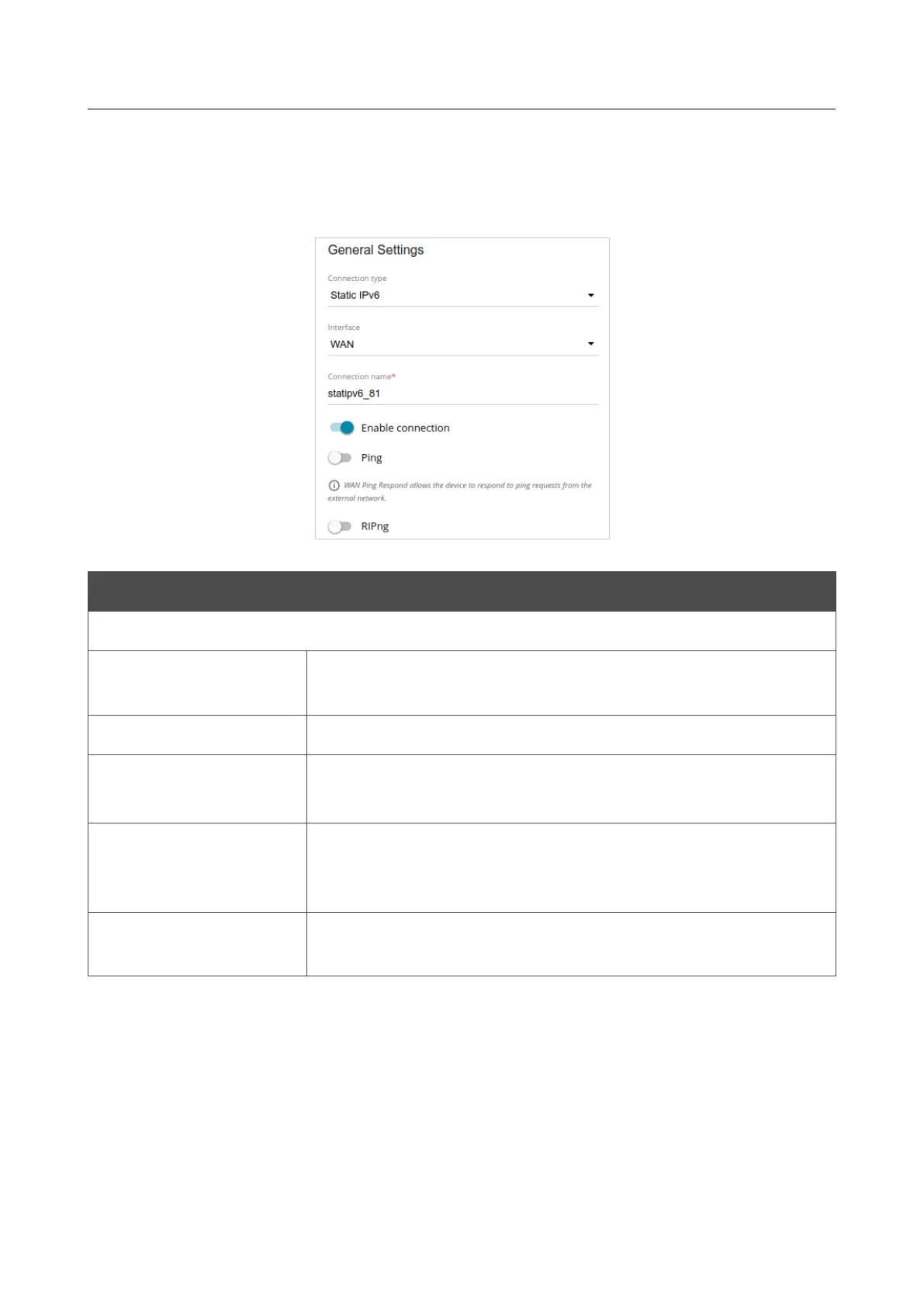 Figure 71. The page for creating a new Static IPv6 connection. The General Settings section.